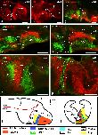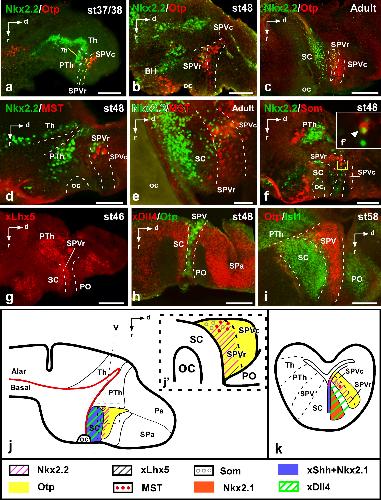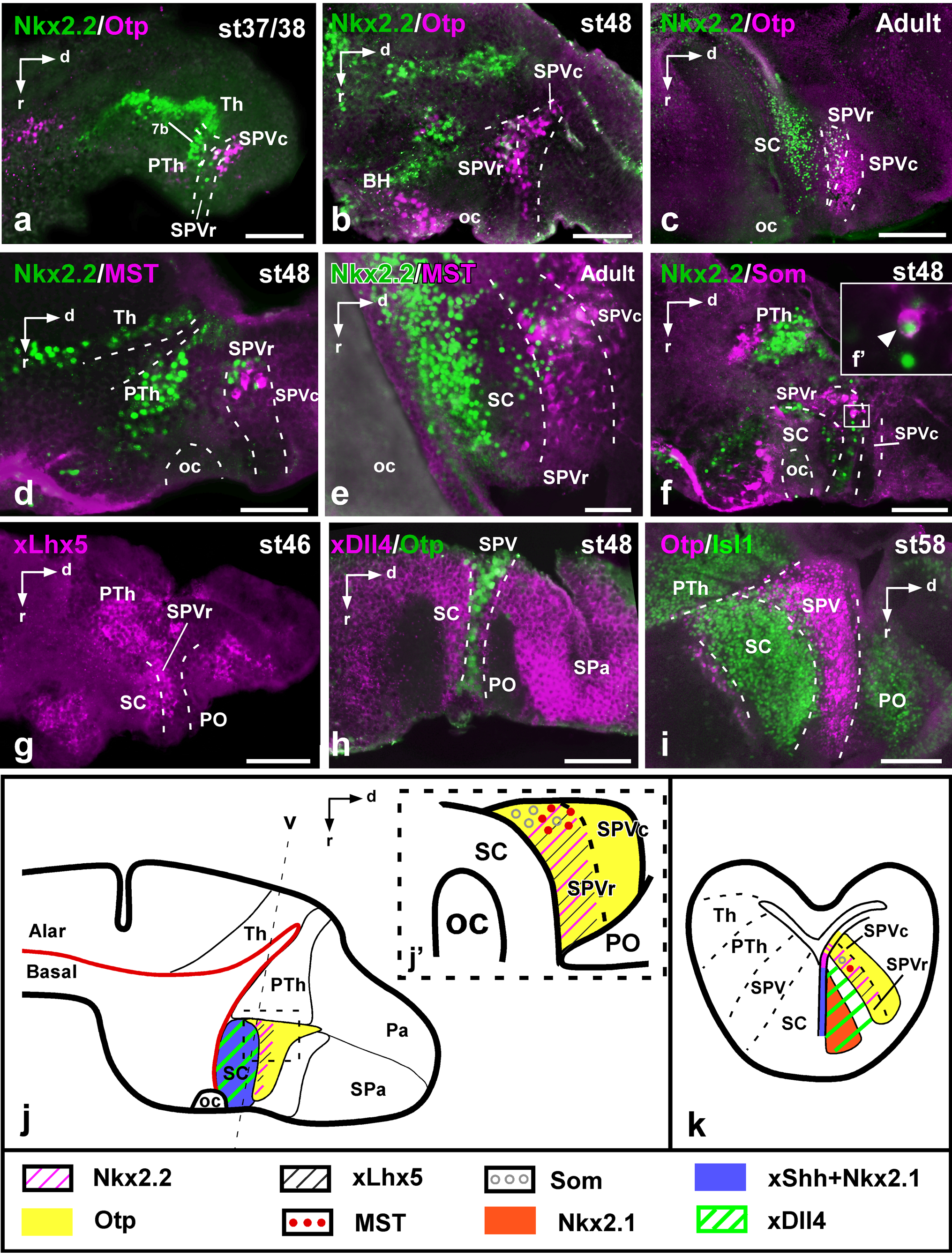 Figure 8. Photomicrographs of sagittal sections through the developing Xenopus SPV region showing the expressions of Nkx2.2 and Otp (a–c), Nkx2.2 and MST (d,e), Nkx2.2 and SOM (f,f'), xLhx5 (g), xDll4 and Otp (h), and Otp and Isl1 (i). Developmental stages are indicated in each photograph. The schematic representation at the bottom summarizes the combinatorial code of markers present in the SPV and its adjacent domains in a lateral view (j,j') and a transverse section (k). The yellow line in a indicates the level of the section shown in Figure 7b. The yellow box in f indicates the higher magnification shown in f' and the arrowhead in f' shows the coexpression of Nkx2.2 and SOM in SPVr. A magenta-green version of this figure is provided as Supporting Information Figure 6. Scale bars = 100 μm in a; 50 μm in b,d–h; 250 μm in g.