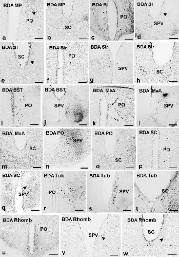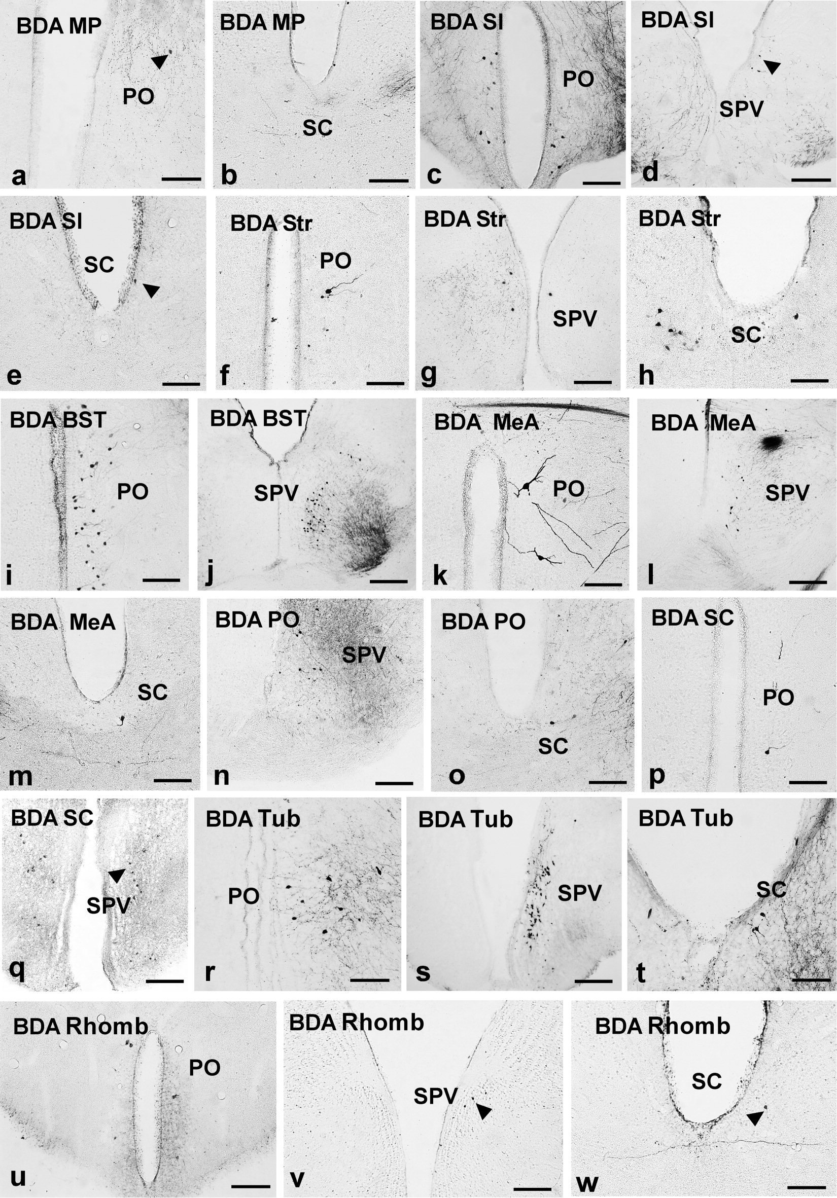 Figure 15. Photomicrographs of transverse sections through the brain of Xenopus showing retrogradely labeled cells and anterogradely labeled fibers in the PO, SPV, and SC regions after BDA injections in the different brain centers indicated in each photograph. The arrowheads in a,d,e,q,v,w point to retrogradely labeled cells. Scale bars = 200 μm in bâd,g,j,l,q,s,uâw; 100 μm in a,e,f,h,I,k,mâp,r,t.
