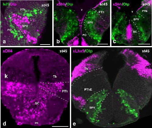 Figure 3. Photomicrographs of transverse sections through the main alar hypothalamic subdivisions of Xenopus at different developmental stages. The boundaries are depicted on the basis of the single expression for xDll4 (d) and the combined expressions of Isl1 and Otp (a), xShh and Otp (b,c), and xLhx9 and Otp (e). The boundaries identified are the PO-SPV (a,b), SPV-SC (c), SPV-PTh (aâc), SC-PTh (d), and SPV-PThE (e). Developmental stages are indicated in each photograph. A magenta-green version of this figure is provided as Supporting Information Figure 1. Scale bars = 50 μm in aâc; 100 μm in d,e
