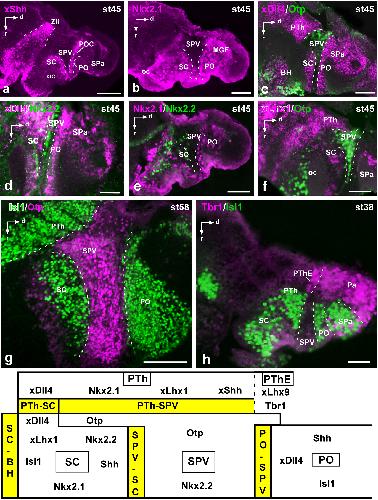 Figure 4. Photomicrographs of sagittal sections through the main alar hypothalamic subdivisions of Xenopus at different developmental stages. The boundaries are depicted on the basis of the single expression for xShh and Nkx2.1 (a,b) and the combined expressions of xDll4 and Otp (c), xDll4 and Nkx2.2 (d), Nkx2.1 and Nkx2.1 (e), xLhx1 and Otp (f), Isl1 and Otp (g), and Trbr1 and Isl1 (h). The boundaries identified are the PO-SPV (aâc), SPV-SC (d,e), SPV-PTh (c,f), and SPV-PThE (h). Developmental stages are indicated in each photograph. The schematic representation at the bottom summarizes the boundaries between the different alar hypothalamic subdivisions and the combinatorial code of markers of each region. The yellow lines indicate the limit between two adjacent regions revealed by the different markers. A magenta-green version of this figure is provided as Supporting Information Figure 2. Scale bars = 50 μm in aâf,h; 200 μm in g
