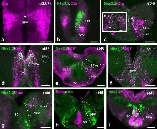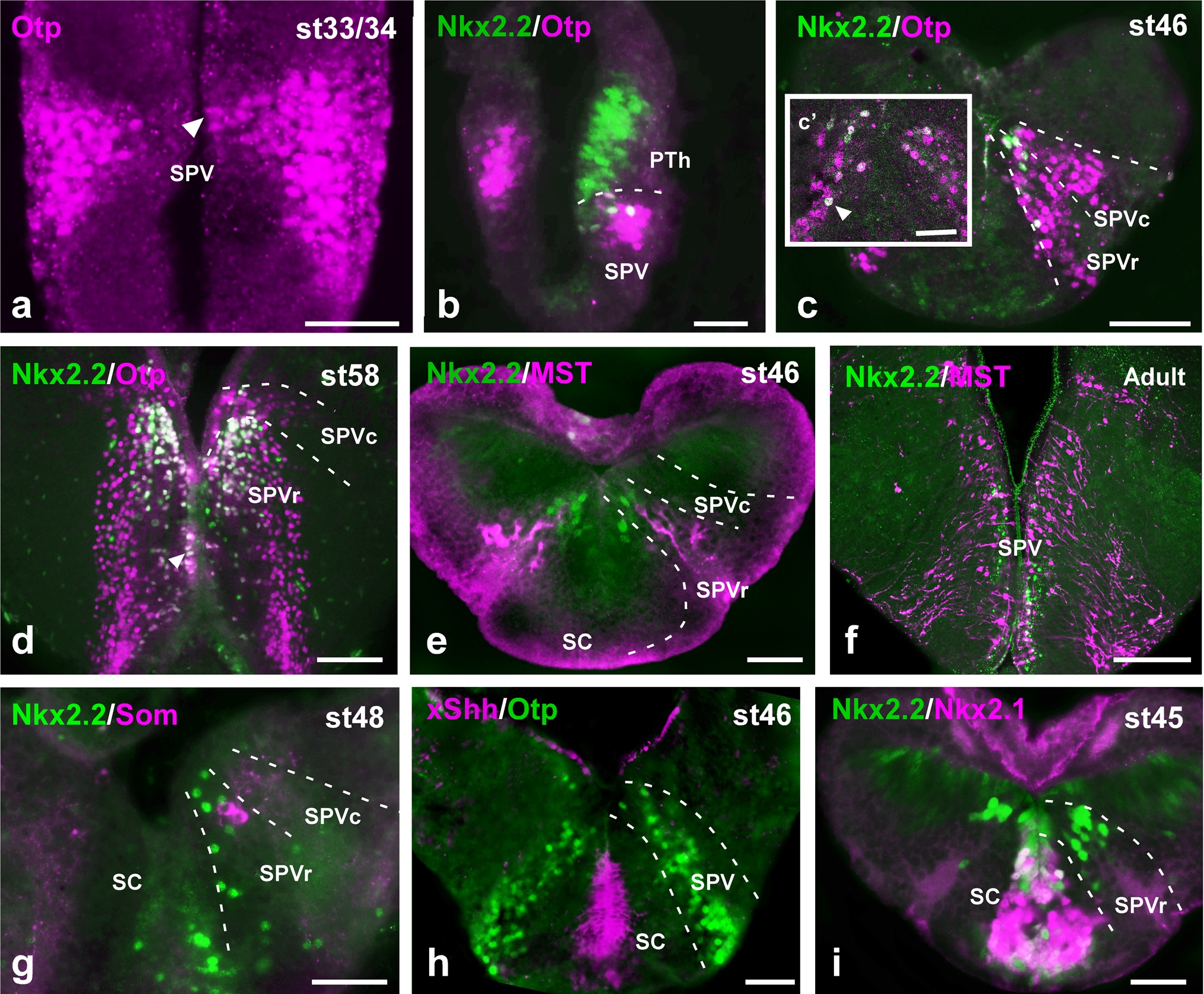 Supplementary Figure 5. Photomicrographs of transverse sections through the developing Xenopus SPV region showing the expressions of Otp (a), Nkx2.2 and Otp (b-f), Nkx2.2 and MST (e,f), Nkx2.2 and SOM (g), xShh and Otp (h), and Nkx2.2 and Nkx2.1 (i). Developmental stages are indicated in each photograph. The arrowhead in a indicates the Otp+ ventricular cells. The arrowheads in c' and d point to the double labeling for Nkx2.2 and Otp in the SPVr portion. Scale bars: 50μm (a-c, f-i), 100μm (d) and 200μm (e). This figure corresponds to the figure 7.