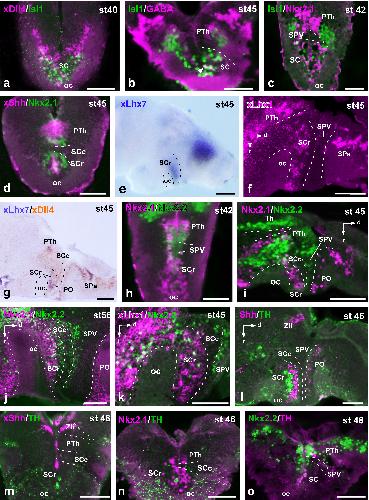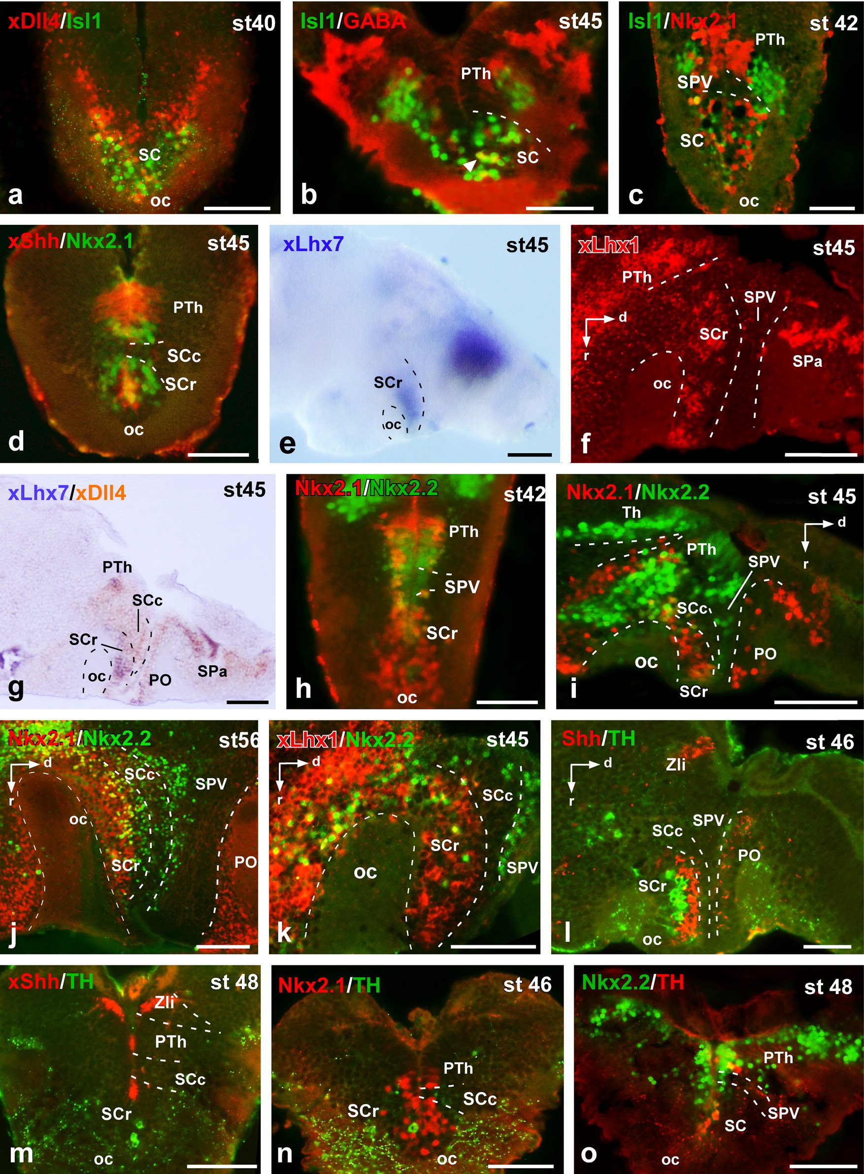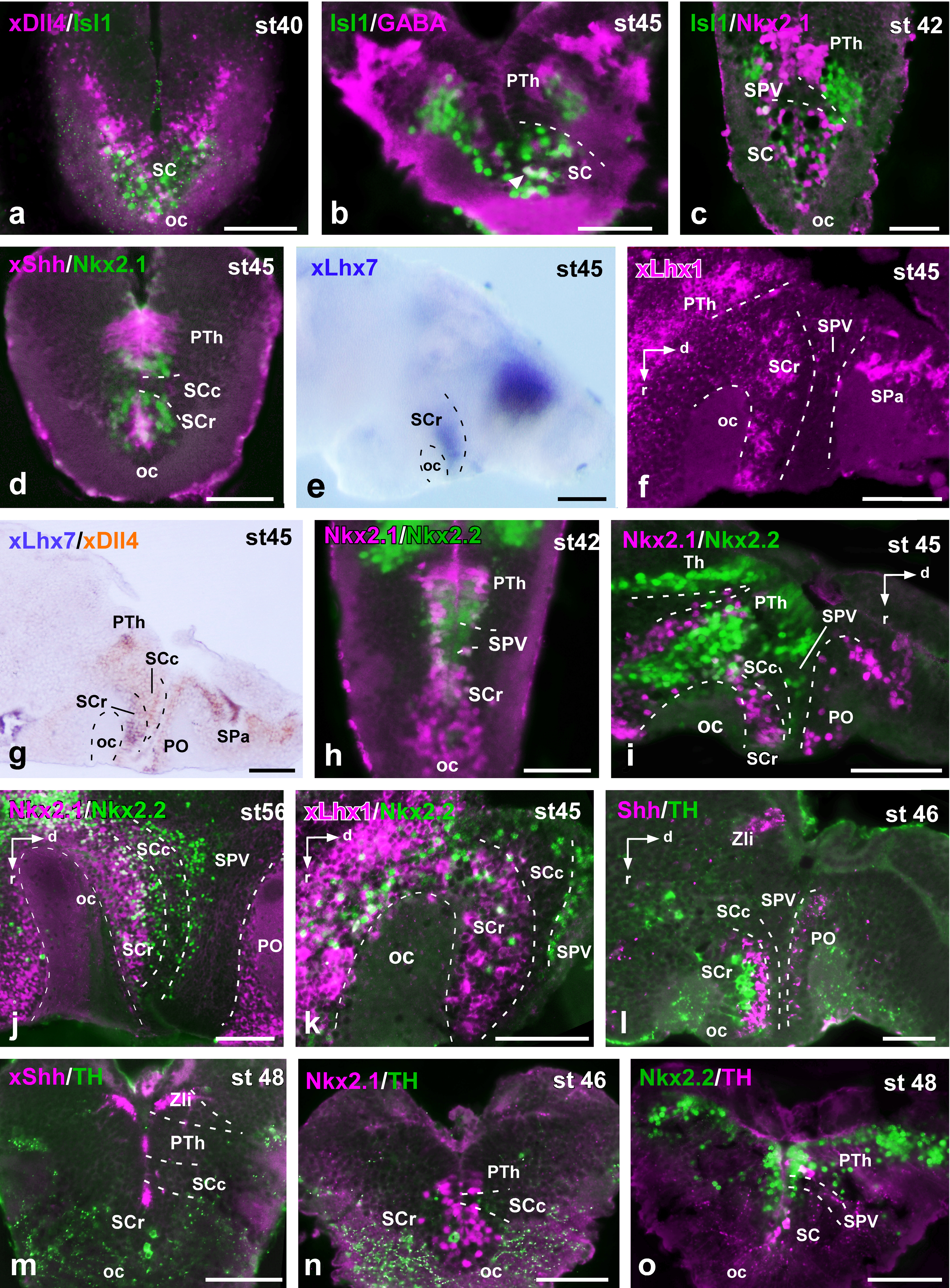 Figure 9. Photomicrographs of transverse (aâd,h,mâo) and sagittal (eâg,iâl) sections through the developing Xenopus SC region showing the single expressions of xLhx7 (e), xLhx1 (f) and the combined expressions of xDll4 and Isl1 (a), Isl1 and GABA (b), Isl1 and Nkx2.1 (c), xShh and Nkx2.1 (d), xLhx7 and xDll4 (g), Nkx2.1 and Nkx2.2 (hâj), xLhx1 and Nkx2.2 (k), xShh and TH (l,m), Nkx2.1 and TH (n) and Nkx2.2 and TH (o). Developmental stages are indicated in each photograph. The arrowhead in b indicates a cell double-labeled for Isl1 and GABA. A magenta-green version of this figure is provided as Supporting Information Figure 7. Scale bars: 200 μm (j), 50 μm (aâi, kâo).