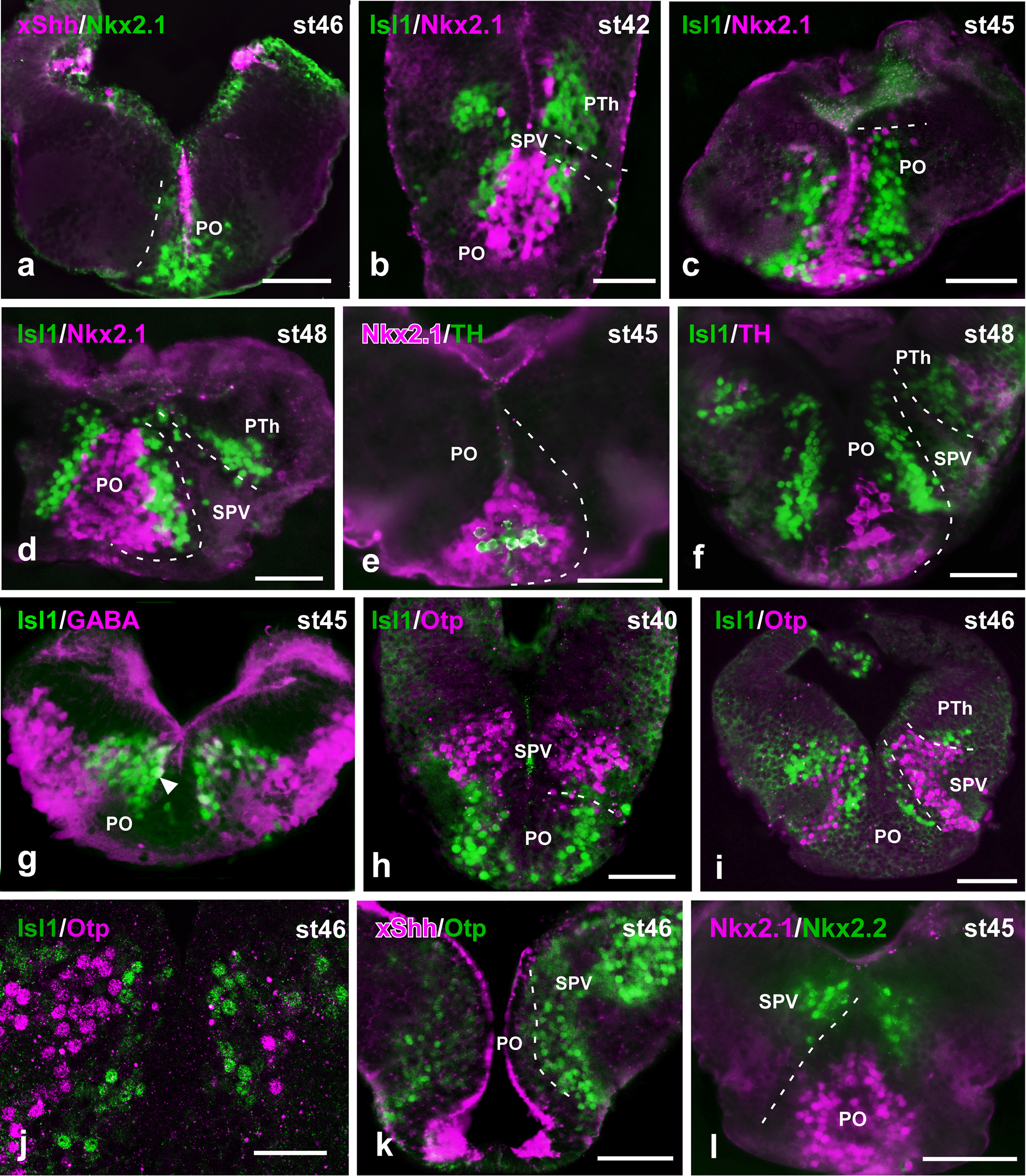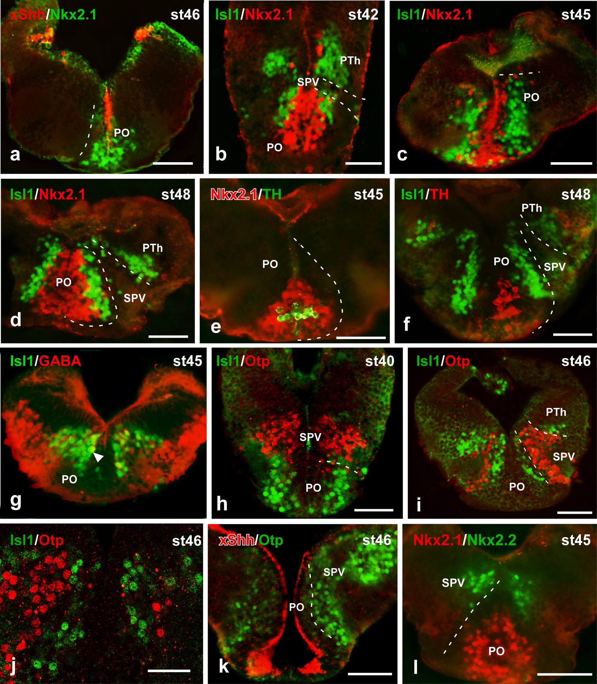 Figure 5. Photomicrographs of transverse sections through the developing Xenopus PO region showing the combined expressions of xShh and Nkx2.1 (a), Isl1 and Nkx2.1 (b–d), Nkx2.1 and TH (e), Isl1 and TH (f), Isl1 and GABA (g), Isl1 and Otp (h–j), xShh and Otp (k), and Nkx2.1 and Nkx2.2 (l). Developmental stages are indicated in each photograph. The arrowhead in g indicates double-labeled Isl1 and GABA cells. The photomicrograph j shows a higher magnification of the area shown in i by confocal microscropy to illustrate the limit between the Isl1+ PO and the Otp+ SPV. A magenta-green version of this figure is provided as Supporting Information Figure 3. Scale bars = 50 μm in a–i,k,l; 25 μm in j.