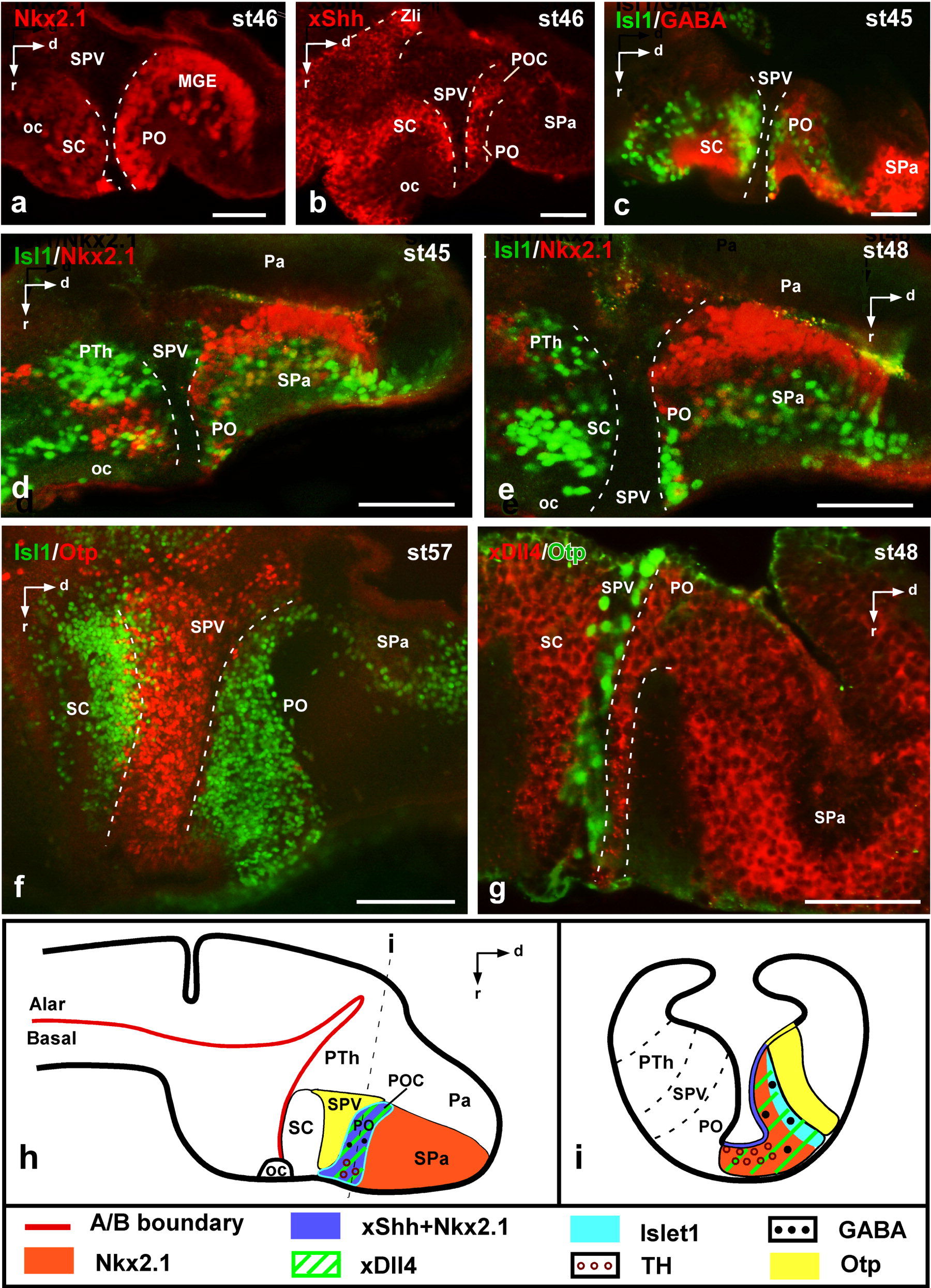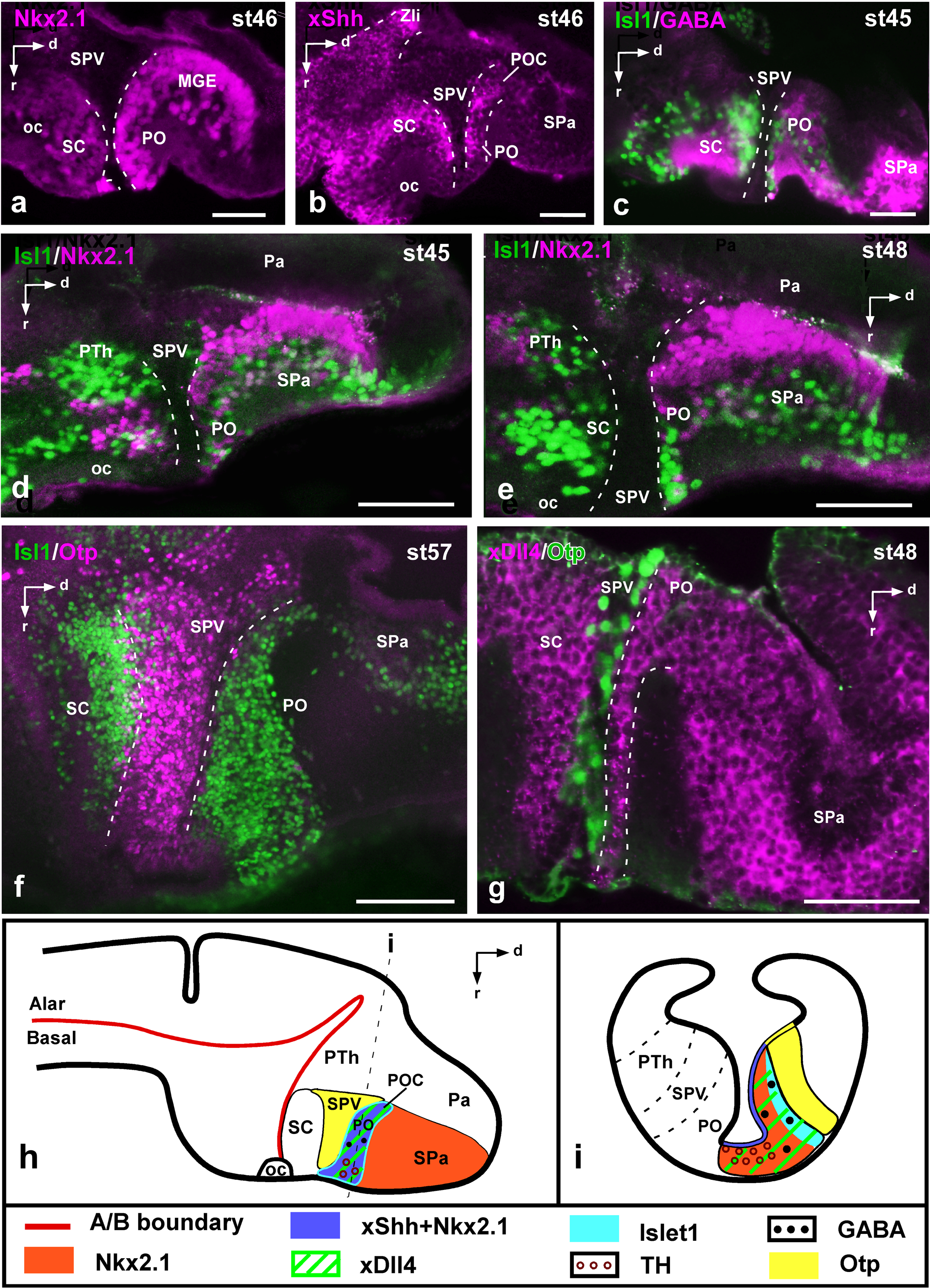 Supplementary Figure 4. Photomicrographs of sagittal sections through the developing Xenopus PO region showing the single expressions of Nkx2.1 (a) and xShh (b) and the combined expressions of Isl1 and GABA (c), Isl1 and Nkx2.1 (d,e), Isl1 and Otp (f), and xDll4 and Otp (g). Developmental stages are indicated in each photograph. The schematic representation at the bottom summarizes the combinatorial code of markers present in the PO and its adjacent domains in a lateral view (h) and a transverse section (i). Scale bars: 50μm (a-e,g) and 200μm (f). This figure corresponds to the figure 6.