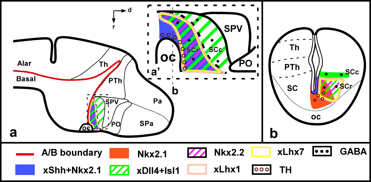 Figure 10. Schematic representation summarizing the combinatorial code of markers present in the SC in a lateral view of the brain (a,a') and a transverse section (b).