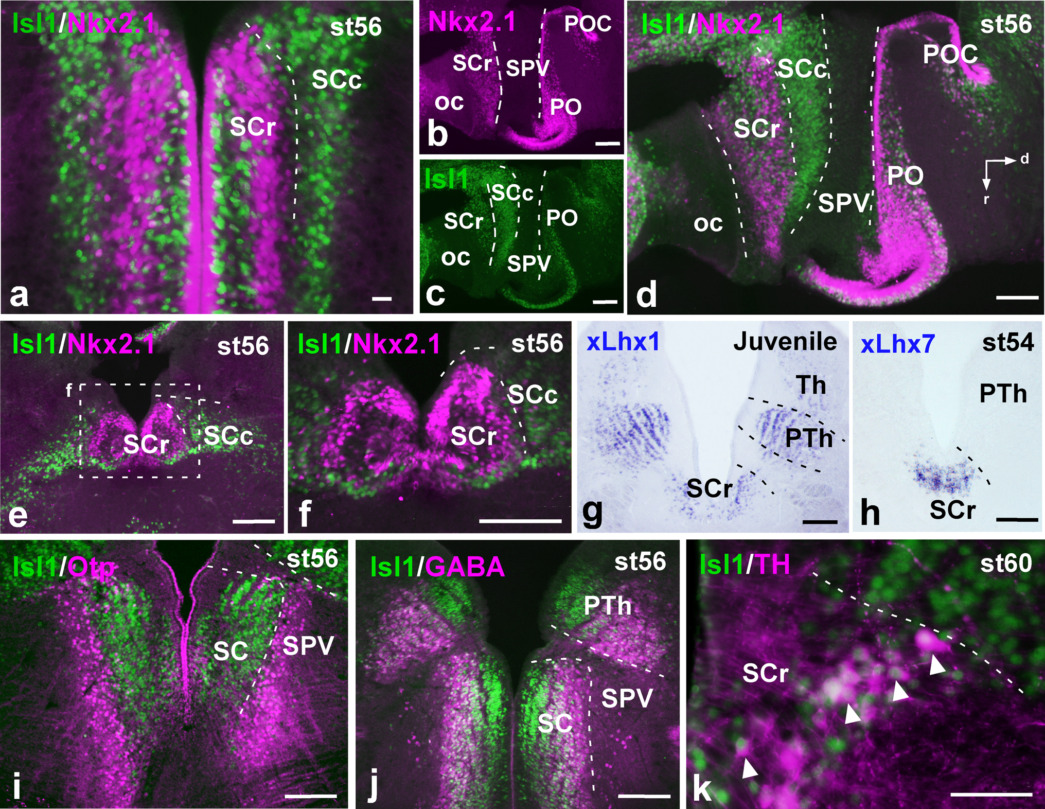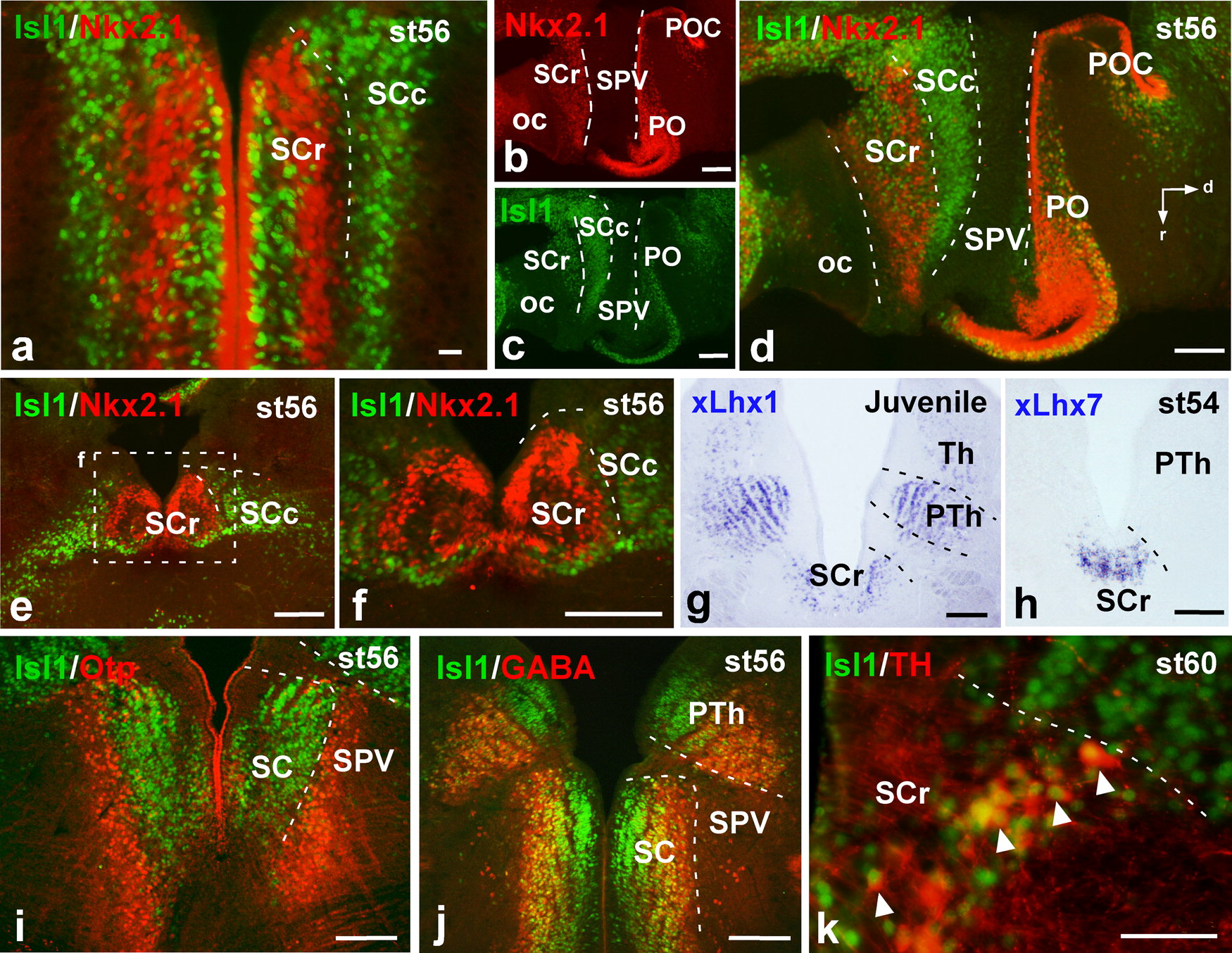 Supplementary Figure 8. Photomicrographs of transverse (a,e-k) and sagittal (b-d) sections through the SC territory in late prometamorphic and juvenile Xenopus showing the single expressions of Nkx2.1 (b), Isl1 (b), xLhx1 (g) and xLhx7 (h) and the combined expressions of Isl1 and Nkx2.1 (a,d-f), Isl1 and Otp (i), Isl1 and GABA (j) and Isl1 and TH (k). Developmental stages are indicated in each photograph. The arrowhead in k indicates a cell double-labeled for Isl1 and TH. Scale bars: 100 μm. This figure corresponds to the figure 11.