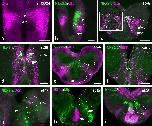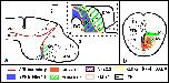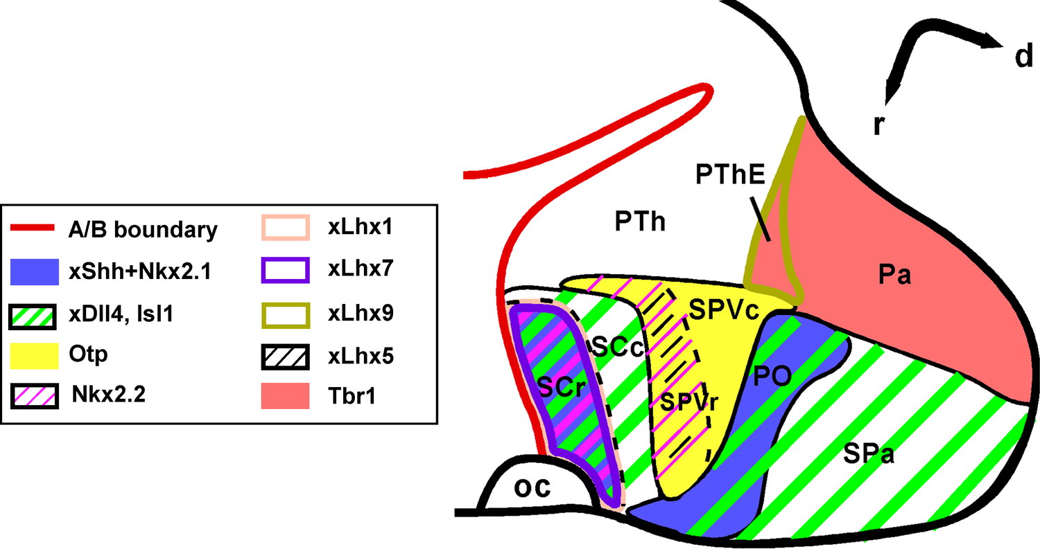 Figure 12. Schematic sagittal representation of the alar hypothalamus of a premetamorphic Xenopus larva summarizing the combinatorial code of transcription factors used in the present study, following the color code indicated in the box.