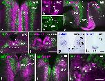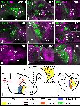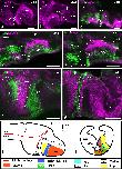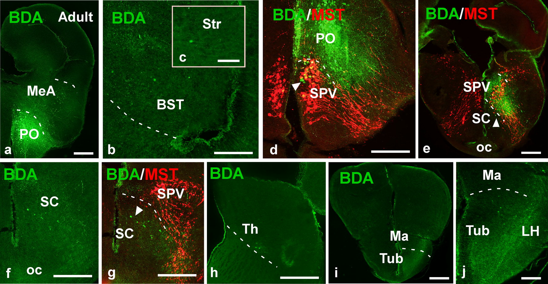 Figure 13. Photomicrographs of transverse sections showing the retrogradely labeled cells and anterogradely labeled fibers after BDA injection in the PO of juvenile Xenopus, combined with the marker MST (d,e,g) to corroborate that the tracer was delivered into this particular area. A magenta-green version of this figure is provided as Supporting Information Figure 9. Scale bars = 250 μm in a,e,i; 200 μm in b,d,f,g,h; 100 μm in c,j.
