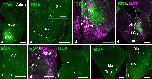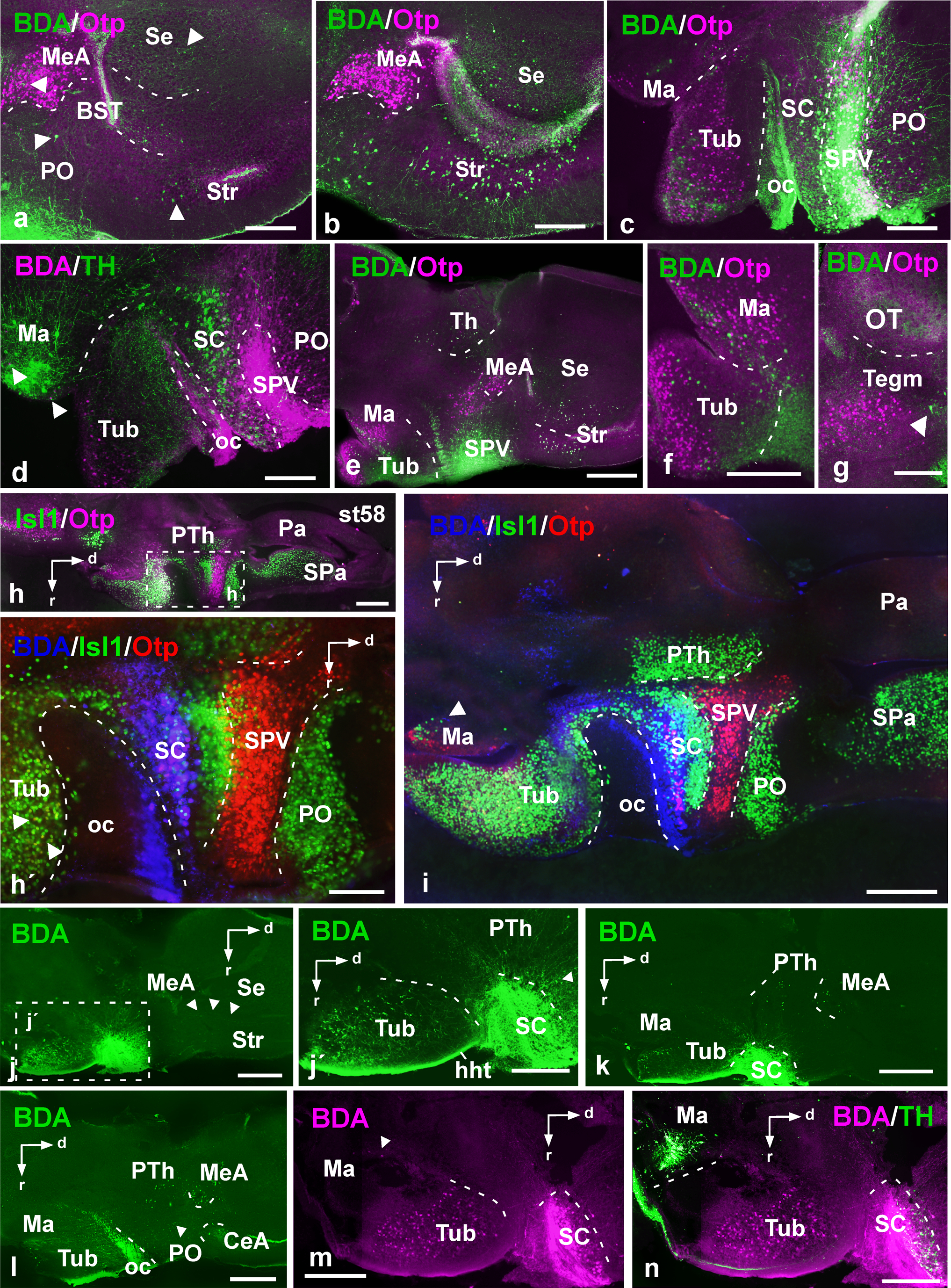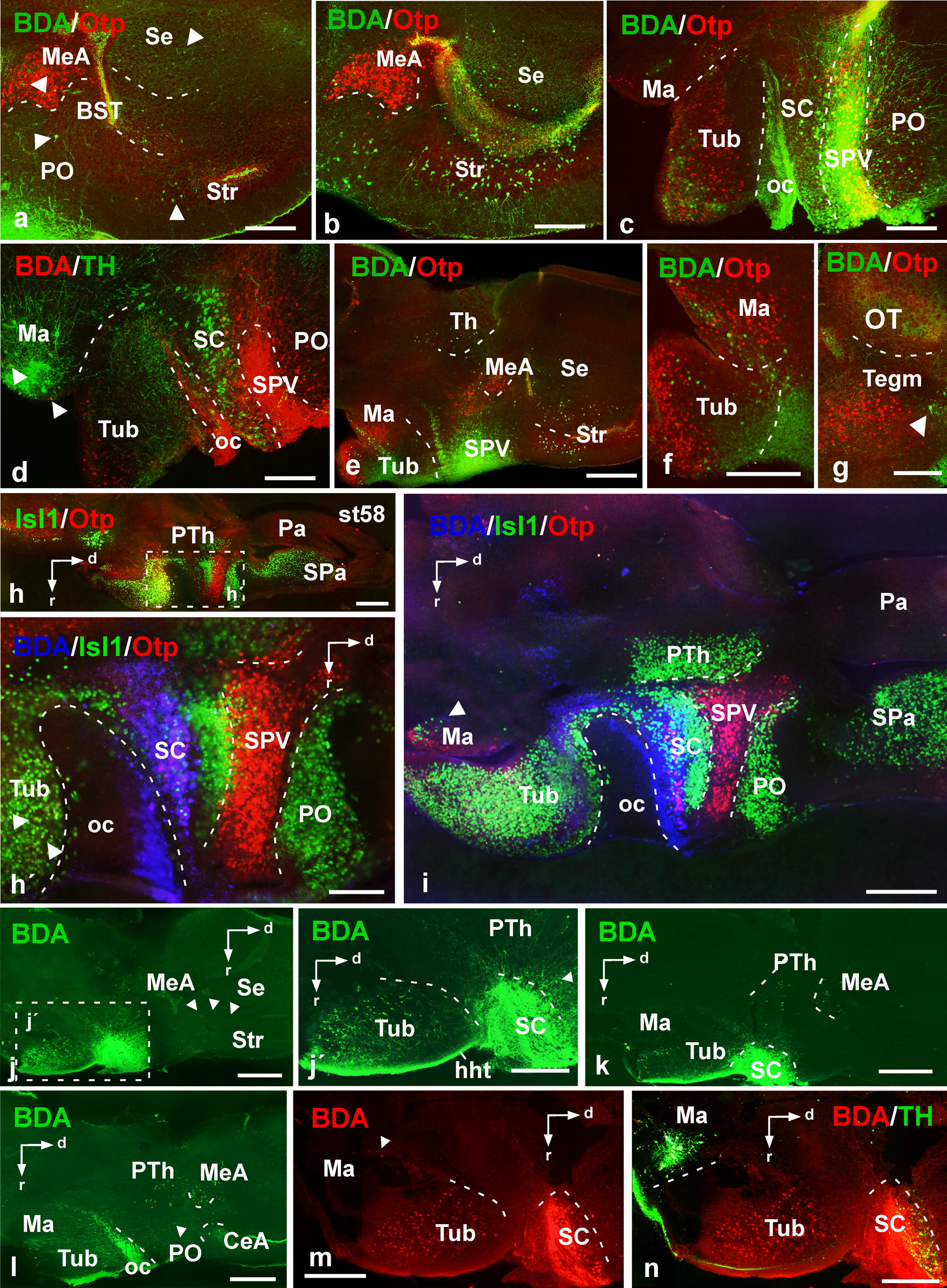 Figure 14. Photomicrographs of sagittal sections showing anterograde and retrograde labeling after BDA injection in the SPV (aâh) and the SC (h'ân) of juvenile Xenopus, combined with the markers Otp (aâc,eâg,h'âj), TH (d,n), and Isl1 (hâj) to corroborate that the tracer was delivered into the selected area. The dashed box in h and j indicate the higher magnification shown in h' and j', respectively. The arrowheads point to retrogradely labeled cells, with the exception of the e,j',n, which indicate labeled fibers toward the hypophysis. In all photographs the olfactory bulb is to the right and the spinal cord to the left. A magenta-green version of this figure is provided as Supporting Information Figure 10. Scale bars = 200 μm in aâe,i,g,h'; 500 μm in f,h,iân).