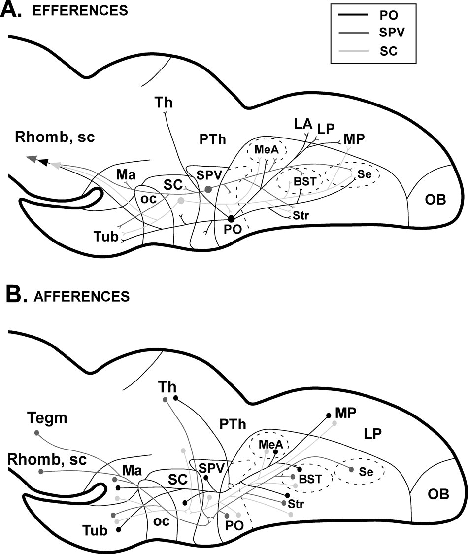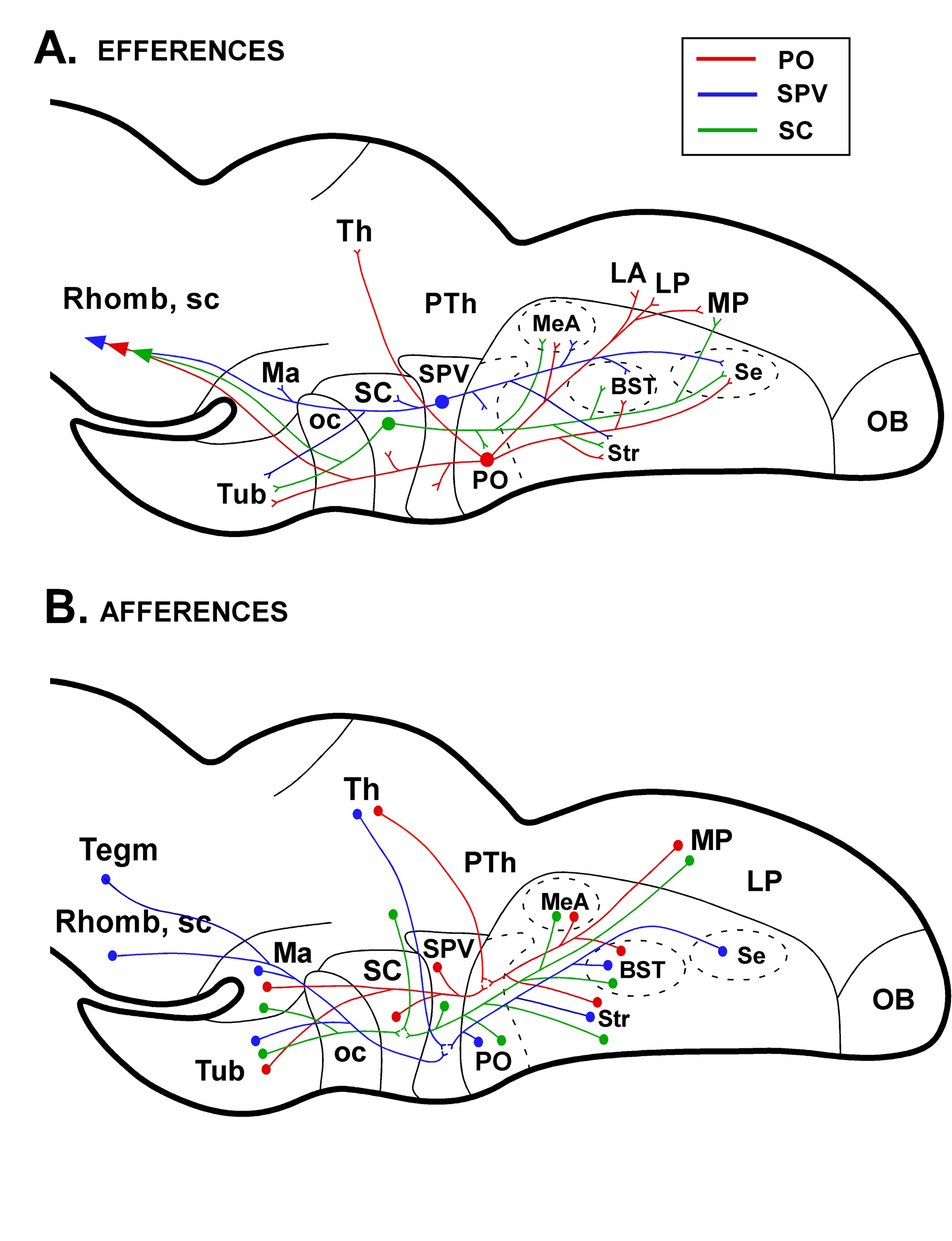 Figure 16. Schemes in sagittal view summarizing the main afferent and efferent connections of the PO, SPV, and SC regions in Xenopus. A color version of this figure is provided as Supporting Information Figure 11.