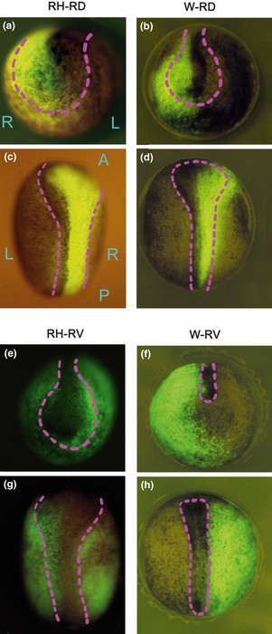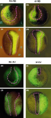 Fig. 2. Representative distributions of the labeled blastomere progeny in the ectoderm of regulated right half (RH) and normal embryos at the late gastrula or early neurula stage. (a, c) A right dorsal blastomere-labeled regulated embryo (RH-RD) at stage (St.) 13. (b, d) A right dorsal blastomere-labeled whole (normal) embryo (W-RD) at St. 15. (e, g) A right ventral blastomere-labeled regulated embryo (RH-RV) at St. 15 and 14. (f, h) A right ventral blastomere-labeled whole embryo (W-RV) at St. 18 and 17. The dashed lines indicate the margin of the neural plate or the top of the neural fold. Embryos are viewed from the anterior (a, b, e, f) and dorsal (c, d, g, h) sides. A, anterior; L, left; P, posterior; R, right.