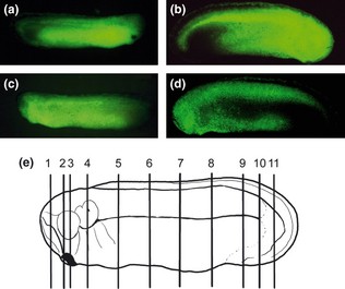 Fig. 3. The completely patterned tailbud larvae and analyzed levels by transverse sectioning. (a�d) External views of a com- pletely patterned (dorsoanterior index (DAI) 5, Kao & Elinson 1988) identical RH-RD tailbud larva (a, c; stage 27) and an identi- cal W-RD larva (b, d; stage 26). Note that the fluorescence derives from not only the epidermis but also the inner tissues, due to the thinness of the epidermis at this stage. The magnifica- tion in a�d is the same, and the samples are viewed from the right side (a, b) and left side (c, d). (e) Levels of transverse sec- tions analyzed along the anteroposterior axis. The numbered sec- tions cut through the following tissues or locations: 1, telencephalon; 2, diencephalon, pharyngeal endoderm anterior to the first visceral pouch; 3, retina, cement gland, mesencephalon, first visceral pouch; 4, ear vesicle, rhombencephalon, heart; 5, pronephric anlage, liver; 6, 7, 8, the intervals between sections 5 and 9 are all the same; 9, anus; 10, the position halfway between Nos. 9 and 11; 11, chordoneural hinge. The abbrevia- tions for the larvae are the same as in Figures 1 and 2.