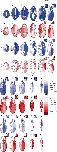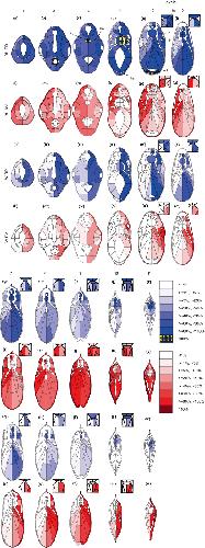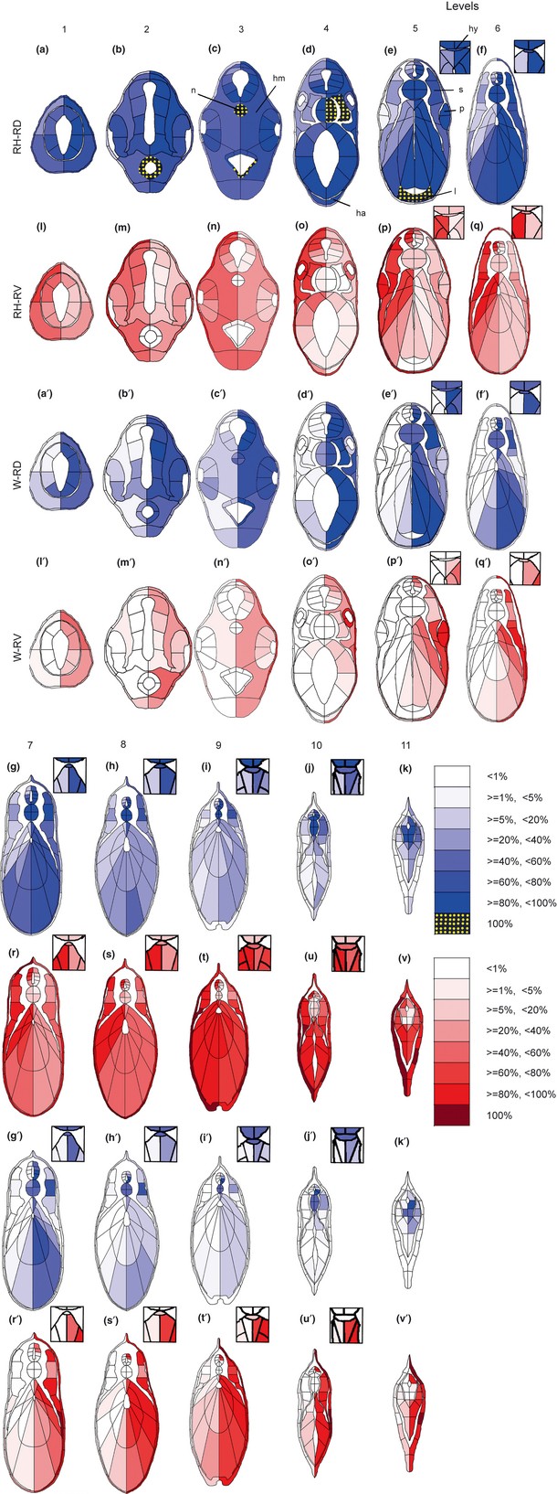 Fig. 5. Averaged distribution maps of the blastomere clones in regulated and normal tailbud larvae. The gradation in blue or red indi- cates the population percentage of the RD or RV clone (the right upper corner of the figure). The numbers on the upper line indicate the analyzed section levels (Fig. 3). The rectangles in the upper right corner of the panels, at levels 5�10, show the magnified tissues around the hypochord. The abbreviations at the left end of the panel lines and the orientations of the embryos in the panels are the same as in Figures 1, 2, and 4, respectively. ha, heart anlage; hm, head mesenchyme; hy, hypochord; l, liver; n, notochord; p, pronephric anlage; s, somite.