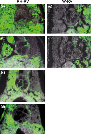 Fig. 6. Distribution of the right ventral blastomere progeny in the notochord and hypochord of regulated and normal larvae. (a�d) The labeled progeny distribution in RH-RV. In the notochord, the RV descendants are distributed in the ventral (a, level 9), right (b, level 6), center and left (c, level 6) regions in three independent larvae, but are not seen in another larva (d, level 6). In the hypo- chord, a descendant cell is seen in (a) and (b), but not in (c) and (d). (e, f) The labeled progeny distribution in an identical W-RV. In the notochord, no RV descendent is seen in either section. In the hypochord, a descendant cell is seen at level 8 (e), but not at level 7 (f). The abbreviations and orientations of the larvae are the same as in Figures 1, 2, and 4, respectively.