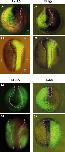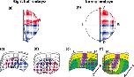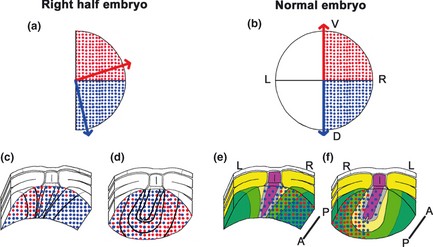 Fig. 7. The putative prospective midlines and distribution of the right blastomere clones on the gastrocoel roof in RH embryos and normal embryos. The densities of the blue and red dots represent the cell-percentages of the RD and RV clones. The left and right half of the panels in the two panel lines show an RH embryo (a) or a regulated RH embryo (c, d), and normal embryos (b, e, f), respectively. (a, b) Animal views of the four-cell stage embryos. The prospective dorsal and ventral midlines are represented with the blue and red arrowheads. (c�f) The gastrocoel roof at stage 15, cut transversely into anterior (c, e) and posterior (d, f) parts. Prospective tissues in the fate maps (Shook et al. 2004; permission from Elsevier) were colored only in normal embryo (e, f): the gastrocoel roof plate (GRP) con- sists of the prospective regions for the ventral part of the notochord (magenta), the hypochord (gray), and the medial ventral cells of the somites (yellow). The lateral endodermal crests (LECs) (yellow green) that derived from the supra-blastoporal endoderm and the endo- derm that originated from the sub-blastoporal region (green) serially flank the GRP. At later stage, the prospective hypochord segments fuse in the ventral position to the notochord (Fig. 5, rectangles), and LECs form the most dorsal regions in the yolky endoderm on both sides. A, anterior; D, dorsal; L, left; P, posterior; R, right; V, ventral.