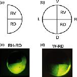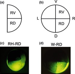 Fig. 1. Nomenclature of the blastomeres and embryos receiving a tracer injection. (a, b) Graphical representation of the animal pole view of a right half (RH) embryo (a) and a normal embryo (b) at the four-cell stage, and the nomenclature of the right blastomeres. (c, d) Animal pole views of a right dorsal blasto- mere-labeled RH embryo (c; RH-RD) and a right dorsal blasto- mere-labeled whole (normal) embryo (d; W-RD) at the eight-cell stage. The orientations are the same in all of the embryos. D, dorsal; L, left; R, right; RD, right dorsal blastomere; RV, right ventral blastomere; V, ventral.