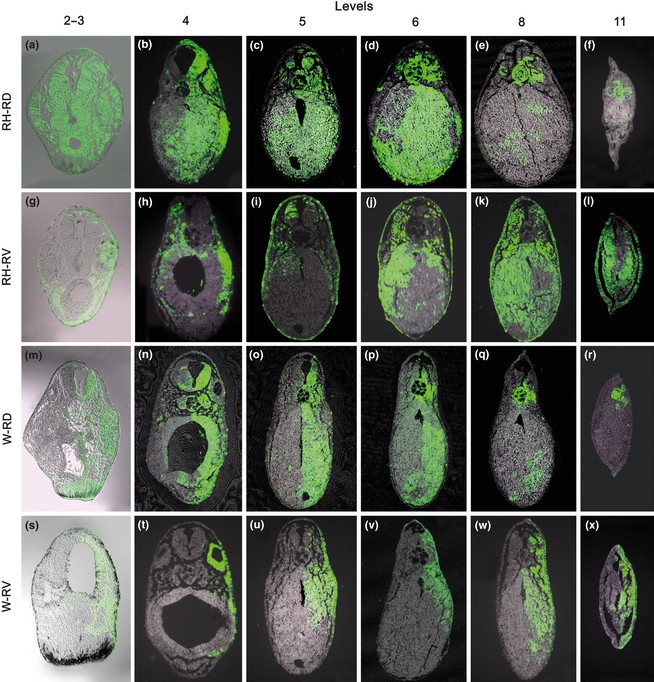 Fig. 4. Section images showing representative distributions of the labeled blastomere progeny in regulated and normal tailbud larvae. (a�f) RH-RD. (g�l) RH-RV. (m�r) W-RD. (s�x) W-RV. The numbers on the uppermost line indicate the analyzed section levels (Fig. 3). The right and the left sides in the panels coincide with those in the embryos, with the dorsal being the top and the ventral the bottom. The abbreviations for the larvae are the same as in Figures 1 and 2.