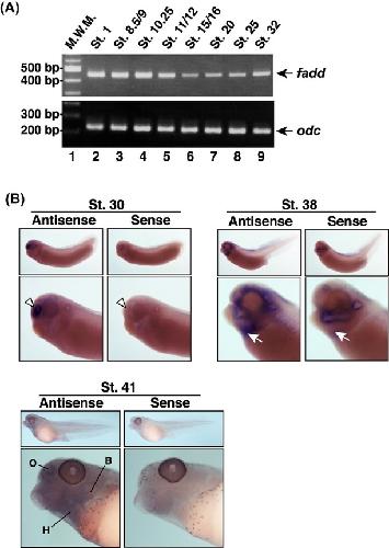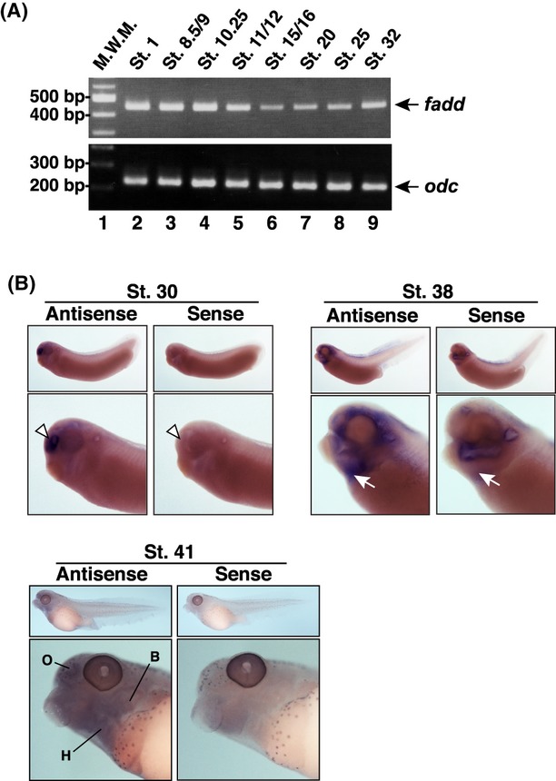 Spatio temporal expression of fadd during early stages of embryonic development. (A) Total RNA isolated from embryos at stages 1, 8.5/9, 10.25, 11/12, 15/16, 20, 25, and 32 was subjected to RT-PCR analysis (lanes 2–9). The resulting PCR products for fadd and ornithine decarboxylase (odc) were resolved by electrophoresis on a 2.5% agarose gel. (B) Whole-mount in situ hybridization (WISH) of fadd transcripts in embryos was performed at the indicated stage of development using a specific RNA probe. In the magnified images, an arrowhead indicates the distal portion of the forebrain and an arrow shows the thoracic portion including the heart primordium. B, branchial arch; H, heart; O, olfactory placode.
