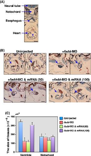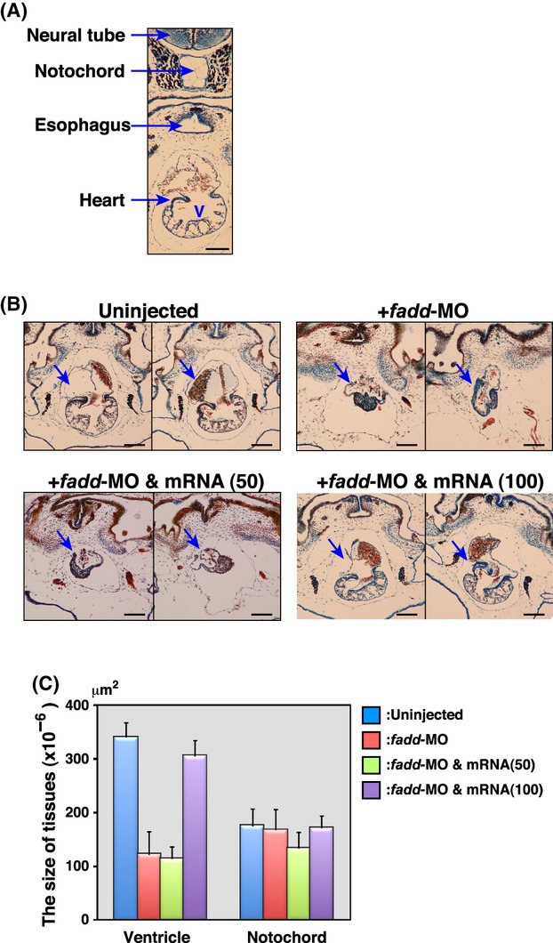 Effects of the antisense morpholino oligonucleotide (MO) on heart development in Xenopus embryos. (A) Histological observation of the developing embryos. Normal embryos are collected at stage 46, and their transverse sections were prepared. A representative picture of the thoracic portion including the heart, esophagus, and notochord was shown. ‘V’ indicates a ventricle. Scale bar indicates 100 μm. (B) Histological analyses of microinjected embryos. Five hundred micromolar fadd-MO was injected without or with 50 or 100 pg of MO-resistant fadd mRNA into embryos at the four-cell stage. Embryos were collected at stage 46, and their transverse sections were prepared. Two representative photographs from each group are shown. The arrows indicate the heart and scale bars indicate 100 μm. (C) Statistical analysis. The ventricular size of the heart in each specimen was calculated by measuring its area in serial sections as described in the experimental procedures. Each bar indicates the mean of the size of the ventricle and notochord of five or six animals in each group and error bars represent the standard deviation of the mean.