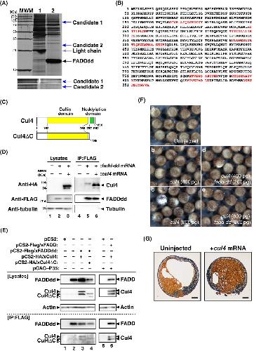 Isolation of a FADDdd-interacting molecule in embryos. (A) Silver staining of immunoprecipitates. Cell lysates were prepared from uninjected embryos (lane 1) or embryos injected with fadd-dd mRNA at the four-cell stage (lane 2), which developed to stage 20, and were incubated with an anti-FLAG M2 affinity gel. Immunoprecipitates within the gel were resolved by SDS-PAGE and visualized by silver staining. Peptide bands specifically observed in FADDdd-expressing embryos were indicated by blue arrows and also magnified separately. (B) The amino acid sequence of Xenopus cullin-4 (Cul4). The entire sequence of Cul4 registered in the NCBI database (NCB Accession Number: NP_001090088) is displayed. Amino acids detected by mass spectrophotometry are shown in red. (C) A schematic diagram of the full-length and truncated mutant of Xenopus Cul4. The yellow and green boxes indicate a cullin domain and a neddylation domain, respectively. (D) Coimmunoprecipitation and immunoblot analysis on interactions between FADDdd and Cul4 in embryos. Cell lysates were prepared from either normal embryos, FADDdd-expressing embryos, or both FADDdd- and Cul4-expressing embryos at stage 20 and incubated with anti-FLAG M2 affinity gel. Immunoprecipitates and aliquots of cell lysates were resolved by SDS-PAGE following immunoblotting with antibodies against FLAG-tag, HA-tag, or α-tubulin, respectively. (E) Assessment of the interactions between FADD and Cul4 in mammalian culture cells. HEK293 cells were transfected with either pCS2 empty vector, pCS2-Flag/xFADD, or pCS2-Flag/xFADDdd in conjunction with pCS2-HA/xCul4 or pCS2-HA/xCul4ΔC. After 2 days of cultivation, cell lysates were prepared from those transfectants and incubated with anti-FLAG M2 affinity gel. Immunoprecipitates and aliquots of cell lysates were resolved by SDS-PAGE following immunoblotting with antibodies against FLAG-tag, HA-tag, or actin, respectively. The white arrowheads indicate the truncated xCul4ΔC proteins. The plasmid DNA carrying the baculovirus p35 gene was used to prevent cell death. (F) Palliative effect of FADDdd to Cul4-induced abnormality of embryos. Wild-type embryos uninjected (a) or injected either with 400 pg (b and d) or 800 pg (c and e) of cul4 mRNA without or with 200 pg of fadd-dd mRNA (d and e) into the equatorial area of two dorsal blastomeres at the four-cell stage. The developing embryos were photographed at stage 14 under the microscope. (G) Histological analysis of Cul4-expressing embryos. Embryos uninjected (left panel) or injected with 800 pg of cul4 mRNA (right panel) were harvested at stage 14, and their cross-sections were prepared for interior observation. Scale bars indicate 200 μm.