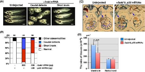 Detection of the non-apoptotic effect of FADD in Xenopus embryos. (A) The morphology of embryos coinjected with fadd and p35 mRNAs. The fadd mRNA-injected or both fadd and p35 mRNAs-injected embryos at 4-cell stage were developed to stage 46. The typical phenotypes of fadd mRNA-injected embryos showing caudal defects (middle) or short trunk (right) were photographed by microscopy. Scale bar indicates 1 mm. (B) A summary of the morphological analysis. The morphology of embryos, which were injected without or with p35 mRNA in combination with fadd mRNA in the indicated amounts, was analyzed at the late tailbud stages. The numbers of embryos displaying normal (white), short trunk (red), caudal defects (blue), and other uncharacterized abnormalities (black) were counted under the microscope, and those percentages were calculated. N indicates the total number of embryos examined in three independent experiments. (C) Histological analysis of the heart in FADD-expressing embryos. Embryos showing short trunk in morphology (A) with uninjected embryos were dissected for histological observation of the heart. The arrows indicate the heart and the arrowheads point to ventricular trabeculae. Scale bars indicate 50 μm. (D) Statistical analysis. The ventricular size of the heart in each specimen was calculated by measuring its area in the serial sections as described in the experimental procedures. Data are presented as the means and standard deviations of six animals in two groups. Significant differences between the two groups were evaluated by the t-test.
