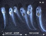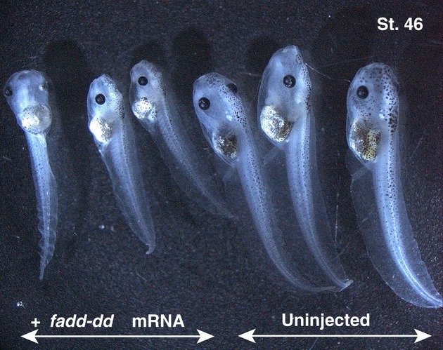 Effects of a truncated form, FADDdd, in embryonic development. Injection of fadd-dd mRNA (50 pg) into embryos was performed at the four-cell stage. Images of normal tadpoles (three animals on the right side) and FADDdd-expressing tadpoles (three animals on the left side) were taken at stage 46 under the microscope. Within the range of 66–100% in five experiments, fadd-dd mRNA-injected embryos showed growth retardation.