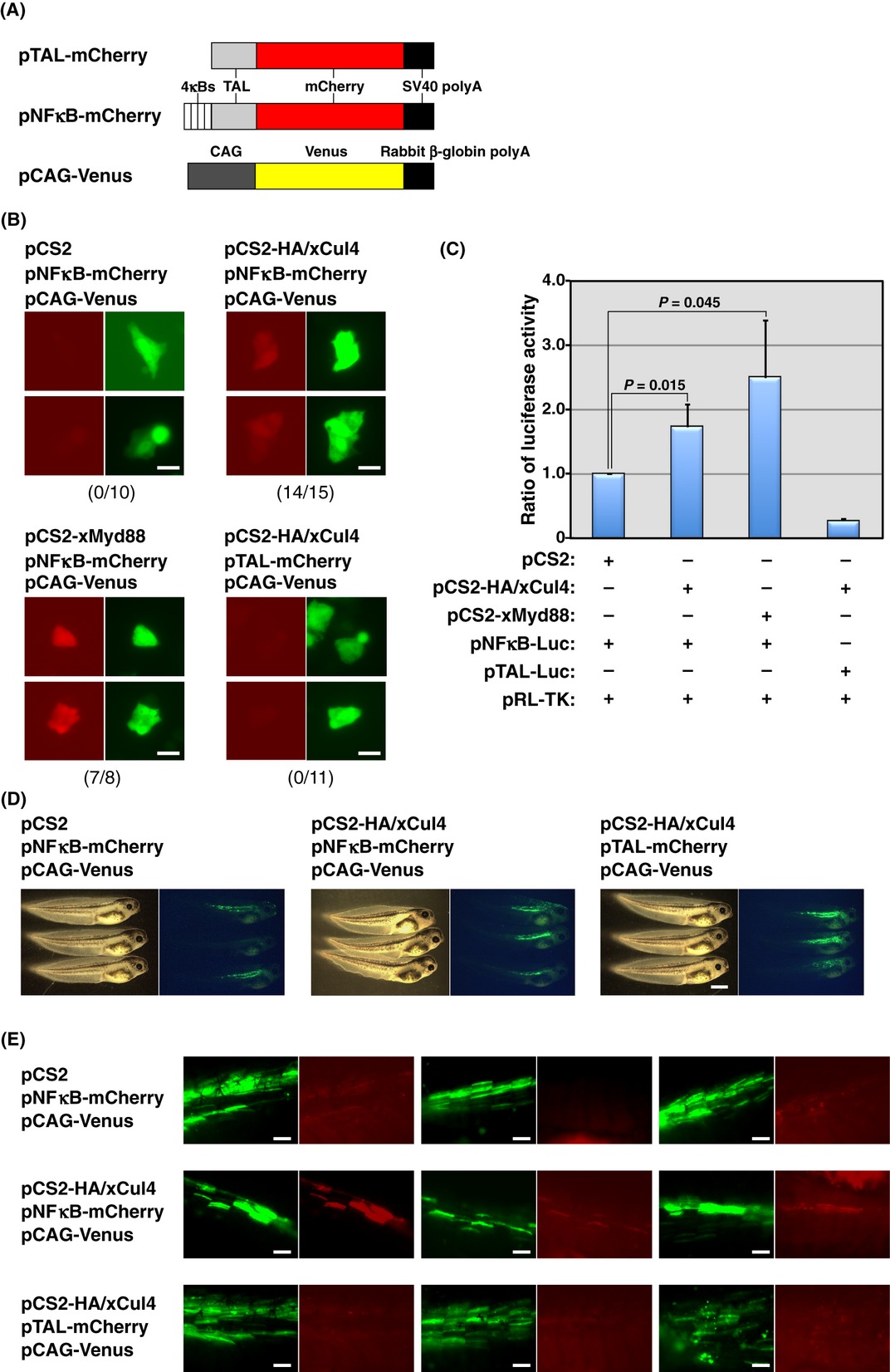 Assessment of the transcriptional activity of NF-κB in Cul4-expressing mammalian cells and Xenopus embryos. (A) A schematic diagram of the reporter plasmid constructs generated for the detection of NF-κB activity. The plasmid pTAL-mCherry consists of a basal TATA-like (TAL) promoter of the Herpes simplex virus thymidine kinase gene and the coding region of mCherry cDNA. The plasmid pNFκB-mCherry contains four contiguous NF-κB enhancer elements (4κBs) at the upstream of the TAL promoter in pTAL-mCherry. (B) Cytological analysis of NF-κB transcriptional activity induced by Cul4 in mammalian cells. Plasmid DNA mixtures: empty pCS2 vector and pNFκB-mCherry, pCS2-HA/xCul4 and pNFκB-mCherry, pCS2-xMyd88 and pNFκB-mCherry, and pCS2-HA/xCul4 and pTAL-mCherry were transiently cotransfected with pCAG-Venus into HeLa cells. After culturing for 48 h, NF-κB activity was detected by monitoring the intensity of the red fluorescence of mCherry proteins in Venus-positive cells by fluorescent microscopy. Numbers in parentheses indicate the number of mCherry-positive cells and Venus-positive cells. Scale bars indicate 50 μm. (C) Enzymatic analysis of NF-κB transcriptional activity induced by Cul4. Plasmid DNA mixtures: empty pCS2 vector and pNFκB-Luc, pCS2-HA/xCul4 and pNFκB-Luc, pCS2-xMyd88 and pNFκB-Luc, and pCS2-HA/xCul4 and pTAL-Luc were transiently cotransfected with pRL-TK into HeLa cells. After culturing for 24 h, NF-κB activity was examined by measuring the enzyme activity of dual luciferases produced in transfected cells using a luminometer. Data are presented as the means and standard deviations of samples counted from four experiments. The statistically significant difference between the two groups was evaluated by Student's t-test. (D) Fluorescent analysis of the transgenic animals. Plasmid DNA mixtures: empty pCS2 vector and pNFκB-mCherry, pCS2-HA/xCul4 and pNFκB-mCherry, and pCS2-HA/xCul4 and pTAL-mCherry were microinjected with pCAG-Venus into four-cell embryos. After developing to stage 42, images of three transgenic tadpoles carrying plasmid constructs from each group were captured as both bright-field (left panels) and yellow fluorescence of Venus (right panels) under the microscope. Representative photographs from two independent experiments were shown. Seven to eight Venus-positive tadpoles in each group were further analyzed their red fluorescence. Scale bars indicate 1 mm. (E) Assessment of the transcriptional activity of NF-κB in Cul4-expressing animals. The transcription activation by NF-κB was detected by monitoring the intensity of the red fluorescence of mCherry in Venus-positive tadpoles by fluorescent microscopy. Magnified images of three transgenic tadpoles from each group were captured to indicate the fluorescence of Venus (left panels) and mCherry (right panels). Scale bars indicate 100 μm.