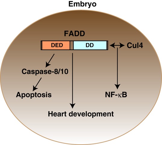Schematic representation of the biological functions via FADD in the Xenopus embryo. When FADD was excessively expressed in embryos, it induced cell death by activating the intrinsic apoptotic machinery including caspase-3. By contrast, the down-regulation of FADD caused irregular development of the heart. Expression of a truncated mutant, FADDdd, which has lost pro-apoptotic activity, perturbed the expression level of the NF-κB-responsive genes, resulting in growth retardation in the embryos. In addition, FADDdd interacts with Cul4. Each of these three experiments indicated a different phenotype of embryos from the other two. Given these results, we concluded that the DED motif of FADD is required for apoptosis in embryos, whereas DD is crucial for the regulation of NF-κB activity. Moreover, Xenopus FADD as well as murine FADD is involved in heart development.