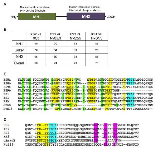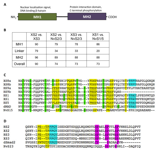 Figure 1. R-Smads are defined by two conserved protein domains. (A) Diagram of a typical R-Smad showing the two conserved domains (MH1 and MH2) with important regions noted. (B) A table of pairwise percent identity of the MAD homology domains and the non-conserved linker regions of Xenopus and Nematostella R-Smads [see Additional file