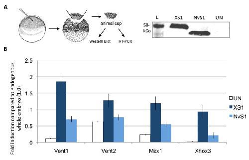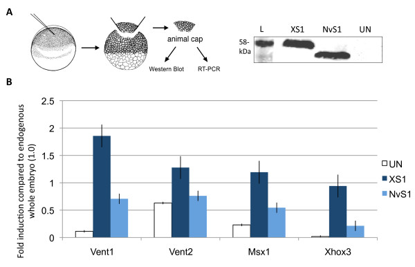 Figure 3. NvSmad1/5 induces expression of downstream BMP pathway genes in the frog embryo. After animal pole injection of XSmad1 or NvSmad1/5 at the 2-cell stage, stage 11 animal caps show elevated expression of genes downstream of the BMP pathway. (A) Depiction of the animal cap assay procedure; animal caps were processed for western blot or RT-PCR when control embryos reached mid-gastrulation (Niewkoop and Faber stage 11). The western blot shows protein translation levels in injected and uninjected whole embryos (L = Benchmark protein ladder, showing the 58-kDa band). XSmad1 and NvSmad1/5 show equal levels of translation, whereas the uninjected embryos show no background signal. (B) Real-time quantitative RT-PCR (qPCR) shows fold induction levels of BMP pathway response genes Vent1, Vent2, Msx1, and Xhox3 compared to the uninjected whole embryos. Uninjected Xenopus animal caps (UN), animal caps injected with XSmad1, and animal caps injected with NvSmad1/5 are shown. The Y-axis of all RT-PCR graphs shows the fold induction compared to endogenous whole embryo (1.0). Error bars indicate the standard error.