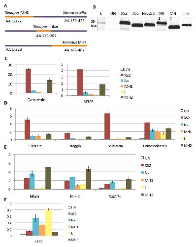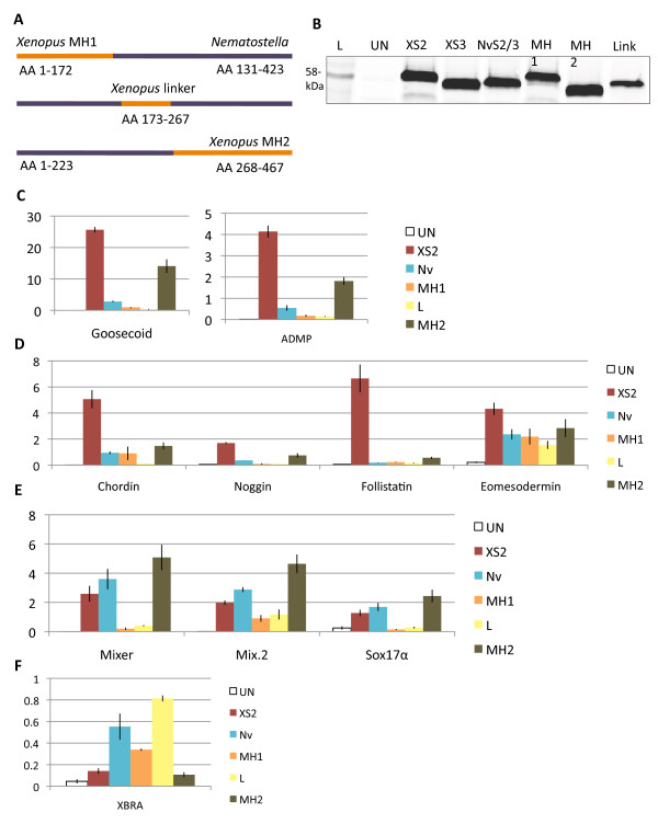 Figure 5. Swapping in the MH2 domain from XSmad2 increases the inductive activity of NvSmad2/3 . (A) Design of chimeras swapping XSmad2 domains into NvSmad2/3. (B) Western blot showing tagged protein translation levels in injected and uninjected whole embryos (L = Benchmark protein ladder, showing the 58-kDa band). XSmad2, XSmad3, NvSmad2/3, MH1 chimera, and MH2 chimera show equal levels of translation, whereas the uninjected embryos show none. The linker chimera (‘Link’) shows slightly lower levels of translation. Note, XSmad3 was injected and included in translation blot to check continuity with previous experiments, but was not used in subsequent animal cap analyses. Animal caps injected with XSmad2, NvSmad2, MH1 chimera, linker chimera, or MH2 chimera mRNA at the two-cell stage show elevated expression of genes downstream in the Activin/Nodal pathway. Real time quantitative PCR shows fold induction levels of Activin/Nodal pathway members on the Y-axis. (C) Class I markers goosecoid and ADMP. (D) Class II markers chordin, noggin, follistatin, and eomesodermin. (E) Class III markers mixer, mix.2, and sox17α. (F) Class IV marker Xbra.