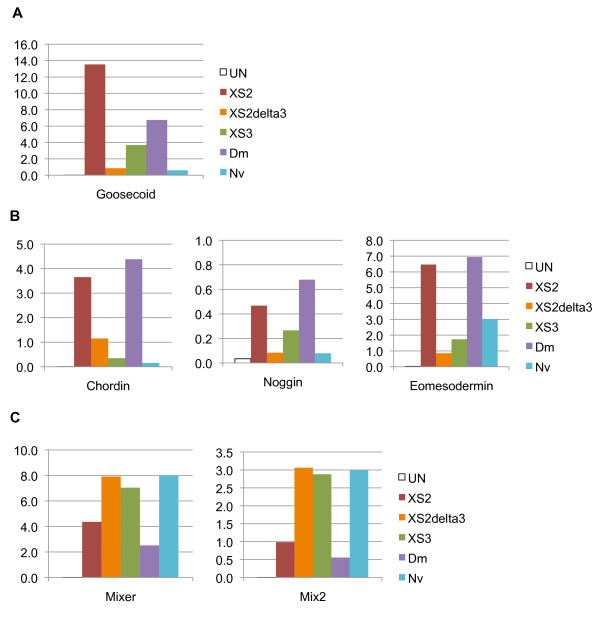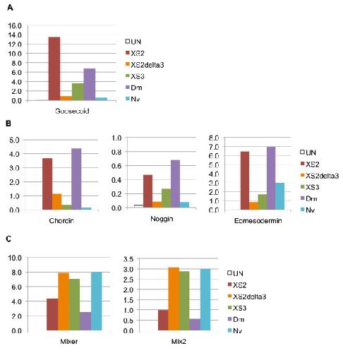 Figure 7. XSmad2ΔExon3 induces expression of downstream Activin/Nodal pathway genes in a pattern resembling XSmad3 rather than full-length XSmad2. Animal caps from gastrulae that had been injected with XSmad2, XSmad2ΔExon3, XSmad3, dSmad2, or NvSmad2 mRNA at the two-cell stage showed elevated expression of genes downstream of the Activin/Nodal pathway. With all markers, the expression patterns induced by XSmad2ΔExon3 (orange column) were more similar to that of XSmad3 (green column) and NvSmad2/3 (teal column) than to full length XSmad2 (red column). (A) Class I marker goosecoid. (B) Class II markers chordin, noggin, and eomesodermin. (C) Class III markers mixer and mix.2.