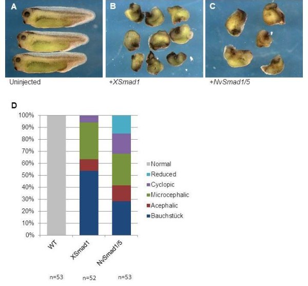 Figure 2. Phenotypes caused by ectopic NvSmad1/5 mRNA mimic phenotypes caused by XSmad1 mRNA. Microinjection of NvSmad1/5 mRNA into the two dorsal blastomeres of a four-cell Xenopus embryo causes similar ventralization phenotypes as injection of XSmad1 mRNA. All tadpoles are shown at stage 34. (A) Shows normal development in Xenopus tadpoles. In contrast, tadpoles in (B) were injected with 4 ng of XSmad1 mRNA and show severe ventralization. (C) Tadpoles injected with 4 ng NvSmad1/5 show a similar but less severe ventralization phenotype. Severity of phenotype was scored according the Dorso-Anterior Index (DAI)