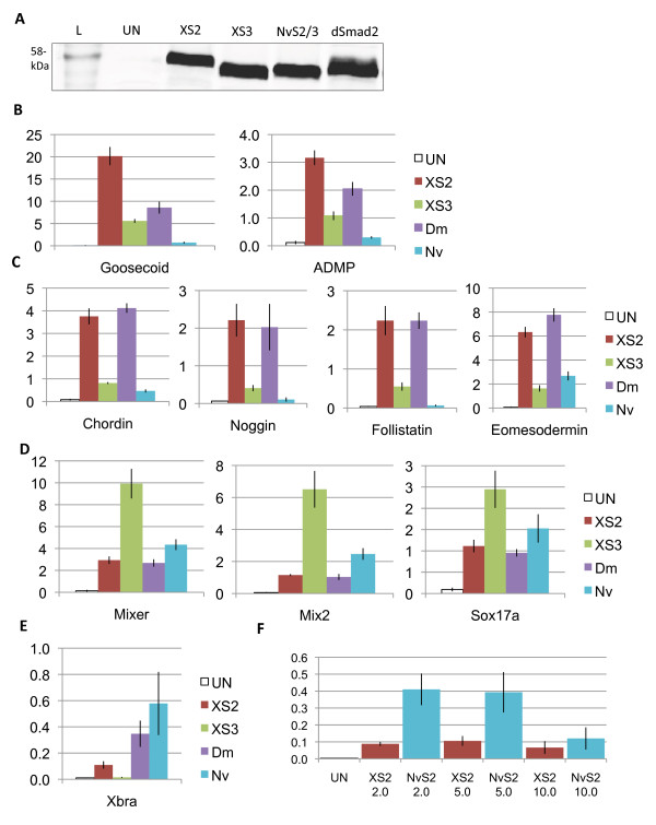 Figure 4. NvSmad2 induces expression of downstream Activin/Nodal pathway genes in Xenopus . Animal caps injected with XSmad2, XSmad3, dSmad2, or NvSmad2 mRNA at the two-cell stage show elevated expression of genes downstream of the Activin/Nodal pathway. (A) Western blot showing tagged protein translation levels in injected and uninjected whole embryos (L = Benchmark protein ladder, showing the 58-kDa band). XSmad2, XSmad3, NvSmad2/3, and dSmad2 show equal levels of translation, whereas uninjected embryos show no background signal. Real-time quantitative PCR (RT-PCR) shows fold induction levels of Activin/Nodal pathway members on the Y-axis. (B) Class I markers goosecoid and anti-dorsalizing morphogenetic protein (ADMP). (C) Class II markers chordin, noggin, follistatin, and eomesodermin. (D) Class III markers mixer, mix.2, and sox17α. (E) Class IV marker Xbra. (F) Xbra induction response to 2 ng, 5 ng, and 10 ng XSmad2 or NvSmad2/3. See text for discussion of marker classes.