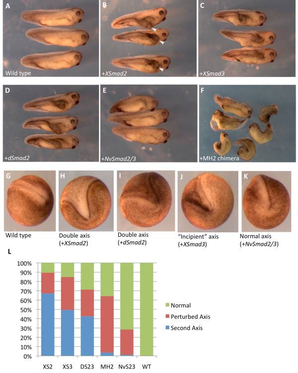 Figure 6. Ectopic overexpression of NvSmad2/3 does not induce a secondary axis in Xenopus embryos. Injection of 0.5 ng XSmad2 mRNA into the marginal zone of one ventralvegetal blastomere at the 8-cell stage can produce a secondary body axis in Xenopus embryos. (A) Uninjected, wild type tadpoles. (B) Tadpoles that were injected with XSmad2 show a classic secondary body axis phenotype (marked with white arrowheads in this photo only). (C) Injection of XSmad3 shows a clear secondary axis. (D) dSmad2 is able to induce the formation of a second body axis. (E) NvSmad2/3 is not able to generate a second body axis, but can perturb the original axis. (F) The MH1 chimera acutely perturbs the original axis, but generates a complete second axis in only a few cases. Embryos were scored for axial phenotypes at neurula stage. Examples: (G) wild type, (H) double axis that would result in a second body axis at tadpole stage (result of XSmad2 mRNA, in this case), (I) another double axis (caused by dSmad2 mRNA, in this case), (J) âincipientâ axis that will eventually get subsumed into the primary axis and result in the âperturbed axisâ phenotype (result of XSmad3 mRNA, in this case, though it could be caused by any of the treatments), (K) phenotype that would be scored as âwild typeâ (result of NvSmad2/3 mRNA, in this case). (L) Bar graph illustrating the range of phenotypes from each treatment. See Additional file