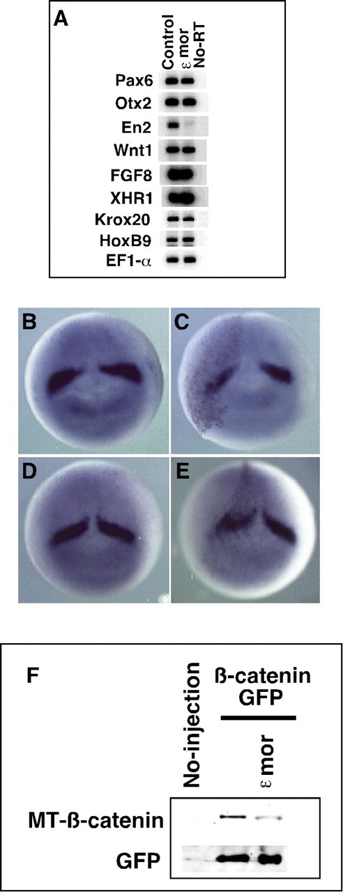 Fig. 5. Regulation of en2 expression and β-catenin stability by PP2A:B56ϵ in the neural ectoderm at stage 14. (A) RT-PCR showing that en2 is reduced by PP2A:B56ϵ morpholino at stage 14. (B-E) Whole-mount in situ hybridization showing pax2.1 (B,C) and XHR1 (D,E) are not reduced by PP2A:B56ϵ morpholino injection at stage 14. (B,D) Control embryos; (C,E) embryos injected with PP2A:B56ϵ morpholino unilaterally. (F) Western blot showing injected β-catenin was less stable in the neural ectoderm of PP2A:B56ϵ knockdown embryos. EFGP was used as a control for both injection and loading.