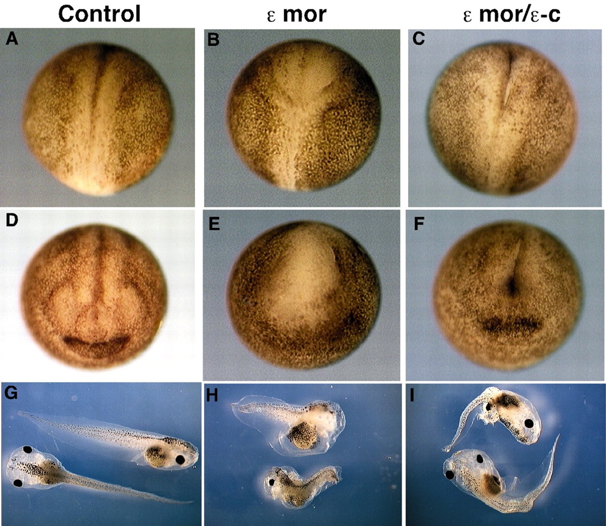 Fig. 6. PP2A:B56ϵ is required for neural tube closure and formation of head structures. (A-C) Dorsal views of stage 16 embryos. (A) Control; (B) embryo injected with 2.5 ng of PP2A:B56ϵ morpholino bilaterally; (C) embryo injected with 2.5 ng of PP2A:B56ϵ morpholino and 20 pg of PP2A:B56ϵ-c mRNA bilaterally. (D-F) Anterior view of stage 16 embryos. (D) Control embryo; (E) embryo injected with 2.5 ng of PP2A:B56ϵ morpholino bilaterally; (F) embryo injected with 2.5 ng of PP2A:B56ϵ morpholino and 20 pg of PP2A:B56ϵ-c mRNA bilaterally. (G-I) Tadpole stage. (G) Control; (H) embryo was injected with 2.5 ng of PP2A:B56ϵ morpholino; (C) embryo was injected with 2.5 ng of PP2A:B56ϵ morpholino and 20 pg of PP2A:B56ϵ-c mRNA.