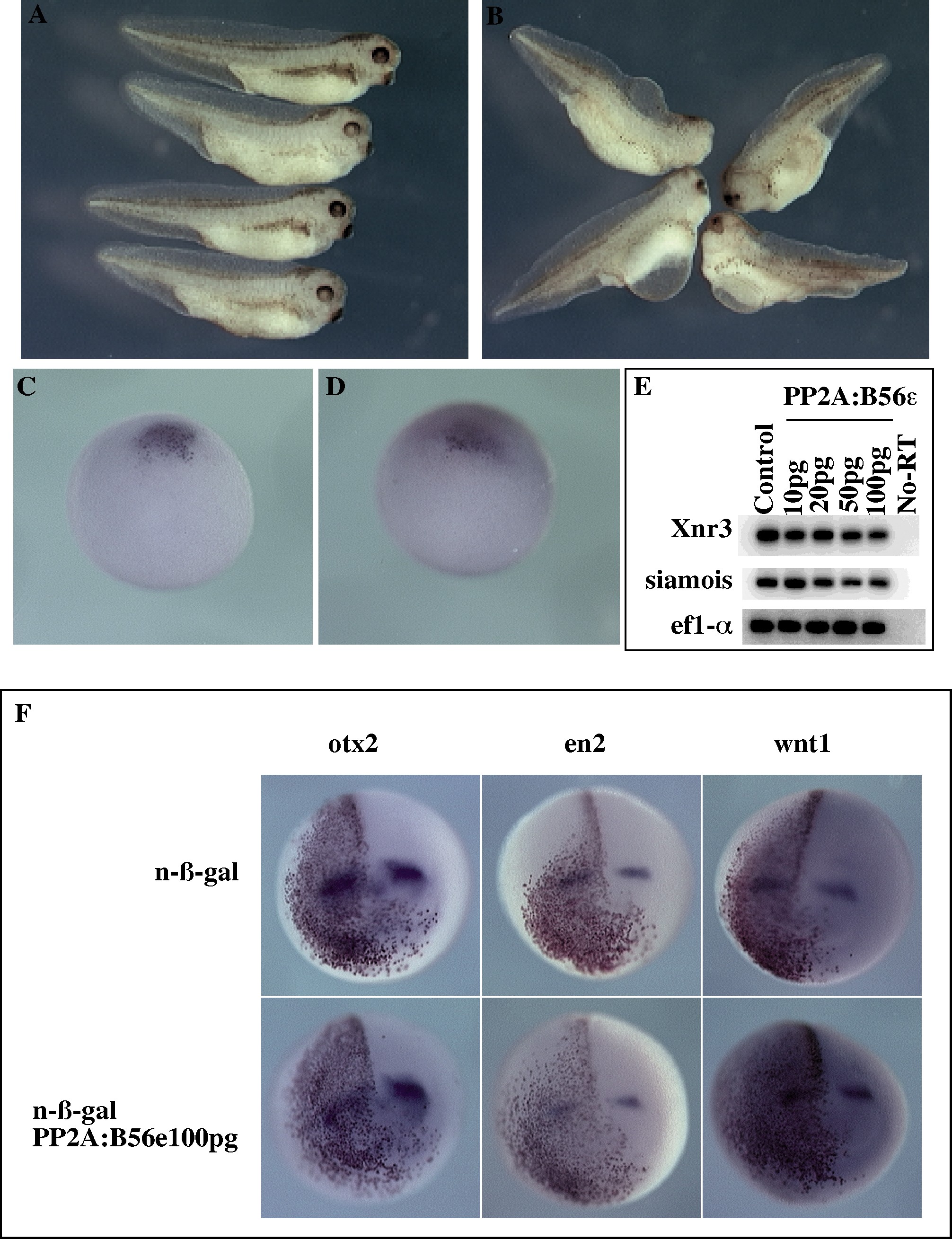 Fig. S1. Overexpression of PP2A:B56e leads to anterior truncation without inhibiting dorsal specific gene expression during gastrulation. (A) Control tadpoles from uninjected embryos. (B) Tadpoles after injection of 100pg PP2A:B56e mRNA into two dorsal blastomeres at the four-cell stage. Nineteen out of a total 37 injected embryos showed anterior truncation. Embryos injected with 100pg of PP2A:B56e mRNA into both ventral blastomeres at the four-cell stage develop normally, while injection of higher dose of PP2A:B56e RNA inhibits cell division (data not shown). (C) Chordin expression in a control stage 10 embryo. (D) Chordin expression at stage 10 is unaffected by injection of PP2A:B56e mRNA. (E) The expression of siamois and Xnr3, as determined by RT-PCR, is normal in PP2A:B56e-injected embryos at stage 10. (F) expression of otx2, but not of en2 or wnt1, is reduced on the injected side in embryos injected with 100pg of PP2A:B56e mRNA into one dorsal blastomere at the four-cell stage (embryos were coinjected with lacZ mRNA as a lineage tracer).