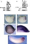 Fig. 1. Expression pattern of PP2A:B56ϵ during early embryonic development of Xenopus. (A,B) Expression of PP2A:B56ϵ in the early blastula. (A) PP2A:B56ϵ expression along the dorsal-ventral axis: 500-cell stage embryos were dissected into dorsal and ventral halves. RNA was prepared from each half. Expression of PP2A:B56ϵ was analyzed by RT-PCR. EF1α was used as loading control. Xnr6 (dorsally restricted expression) was used as a control for accurate dissection. (B) PP2A:B56ϵ expression along the animal-vegetal axis: 500-cell stage embryos were dissected into animal, marginal zone, and vegetal pieces. RNA was prepared from each and expression of PP2A:B56ϵ was analyzed by RT-PCR. VegT (vegetal pole restricted expression) was used as a control for accurate dissection. (C-F) PP2A:B56ϵ expression as determined by in situ hybridization of hemisections. (C) PP2A:B56ϵ expression in the dorsal marginal zone of an early gastrula stage (stage 10) embryo. (D. Expression in marginal zone of a midgastrula (stage 11) embryo; (E) expression in neural ectoderm of a midneurula stage (stage 15) embryo. (F) Higher magnification of E showing PP2A:B56ϵ expression in the anterior neural ectoderm. (G) PP2A:B56ϵ expression in a stage 33 tadpole. Arrows in E and F indicate the anterior edge of PP2A:B56ϵ expression domain in the neural ectoderm.