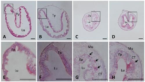 Figure 3. T3 induces intestinal remodeling in premetamorphic X. tropicalis tadpoles.Stages 54 X. tropicalis tadpoles were treated with 10 nM T3 at 25°C. The intestine was isolated from the tadpoles at day 0, 1, 3, and 5, respectively. The intestine was fixed, sectioned, and stained with MGPY as in Fig. 2. A–D: a cross-section of the intestine after 0, 1, 3, 5 days of T3 treatment, respectively. E–H: the enlarged image of the boxed area for the corresponding tissues in A–D, respectively. Note that after 3 days of T3 treatment, the MGPY staining became weaker in larval epithelium as the cells undergo apoptosis. At the same time, the newly formed, proliferating adult epithelial islets were strongly stained by MGPY (arrows). The connective tissue (CT) and muscles (Mu) increased dramatically during metamorphosis. Ep: epithelium; Lu: lumen; Ty: typhlosole. Scale bars: 50 µm.