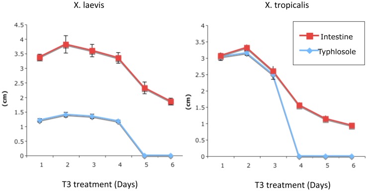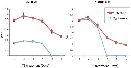 Figure 5. Reductions in the length of typhlosole and the small intestine of premetamorphic X. laevis and X. tropicalis tadpoles upon T3 treatment.Stage 54 X. laevis or tropicalis tadpoles were treated with 10 nM T3 at 18°C (Xenopus laevis tadpoles) or 25°C (Xenopus tropicalis tadpoles) for the indicated days and the intestine was isolated. The length of the typhlosole and the small intestine were measured. Note that the lengths of the intestine was reduced upon T3 treatment and that after 4–5 days of treatment, the typhlosole was no longer identifiable due to metamorphic changes in the intestine, resembling that at the climax of metamorphosis. The faster changes for X. tropicalis tadpoles were in part due to the higher temperature at which the animals needed to be reared.
