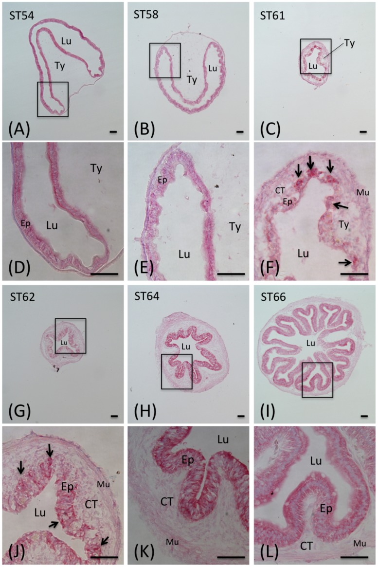 Figure 2. Morphological changes in the Xenopus tropicalis intestine during natural metamorphosis.The intestine of Xenopus tropicalis tadpoles at stage 54 to 66 was isolated and stained with MGPY and photographed with a light microscope. A–C and G–I: a cross-section of the intestine at the indicated stage. D–F and J–L: the enlarged photo of the boxed area in A–C and G–I, respectively. Note that during metamorphosis, the MGPY staining became weaker in larval epithelium as the cells undergo degeneration. At the climax of metamorphosis, the newly formed, proliferating adult epithelial islets were strongly stained by MGPY (arrows). The connective tissue (CT) and muscles (Mu) increased dramatically during metamorphosis. Ep: epithelium; Lu: lumen; Ty: typhlosole; Scale bars: 50 µm.
