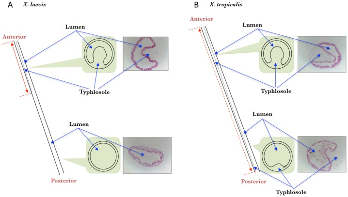Figure 4. The typhlosole is present in the entire small intestine of premetamorphic X. tropicalis tadpoles (A) but only in the anterior small intestine of premetamorphic X. laevis tadpoles (B).A schematic diagram of the intestine from the anterior to the posterior is shown on the left (dashed lines indicate the boundaries of typhlosole with the intestines). On the right of each panel shows representative MGPY-stained cross-sections of the intestine from indicated regions of the intestine of premetamorphic tadpoles at stage 54. In the middle is a schematic drawing of the cross-section showing the presence or absence of the typhlosole. Note the presence of the typhlosole in the posterior half of the small intestine in X. tropicalis but not X. laevis.