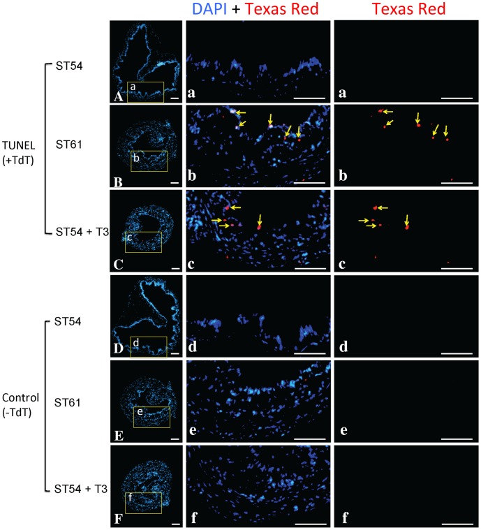 Figure 6. Intestinal epithelial apoptosis occurs during natural and T3-induced metamorphosis in X. tropicalis.The intestine from tadpoles at premetamorphic stage 54 (ST54), the climax of metamorphosis (ST61), or ST54 but treated with 5 nM T3 for 3 days (ST54+ T3), were analyzed by TUNEL assay (A–C) or TUNEL without the enzyme TdT as a the negative control (D–F). The biotin-dUTP labeled apoptotic cells were visualized with Texas-Red labeled Streptavidin and the nuclei were stained with DAPI. The boxed areas were shown at a higher magnification (a-f) with the apoptotic cells indicated with yellow arrows in either merged (DAPI+Texas Red) and single channel of red fluorescence (Texas-Red) images. Scale bar: 50 µm.