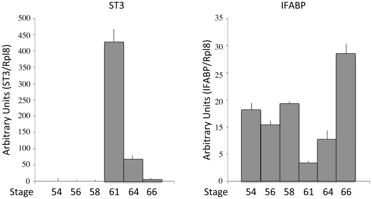 Figure 7. ST3 is upregulated while IFABP is downregulated during X. tropicalis intestinal metamorphosis.Total RNA were extracted from intestines of tadpoles at the indicated stages and analyzed by qRT-PCR. The expression levels for ST3 or IFABP were normalized against the control gene rpl8 and represented as means with with standard deviations in arbitrary units.