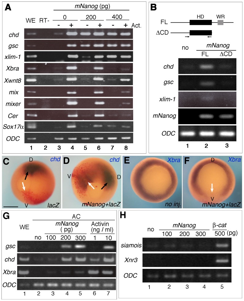 Figure 2. mNanog possesses dorsal mesoderm-inducing activity.A) RT-PCR analysis of various marker gene expressions. Expressions of chd, gsc, and xlim-1 (dorsal mesoderm markers), Xbra (pan-mesoderm marker), Xwnt8, mix, mixer (ventral mesoderm markers), Cer, and Sox17alpha (endoderm marker) were observed. Ornithine decarboxylase (ODC) was also observed as a quantitative control. 200 pg (lane 5, 6) or 400 pg (lane 7, 8) of mNanog was injected into the AC region of 2-cell embryos. ACs were dissected at stage 9, treated with 10 ng/ml of Activin A (lane 4, 6, 8), and cultured until stage 11. Whole embryo (WE; stage 11) was also examined. B) Full-length (FL) or a deletion mutant of mNanog (deltaCD) was injected and marker gene expressions were observed. Upper column shows a diagram of the mNanog construct. Filled and gray boxes indicate the homeodomain (HD) and W-repeat (WR) regions, respectively. Arrow shows the position of primers for RT-PCR. Lower column shows the result. Non-injected AC (lane 1); full-length (FL) mNanog injected (lane 2); mNanogΔCD injected (lane 3). The level of mNanog was also observed to check the precision of injection (4th column). C–F) The effects of mNanog injection on endogenous chd/Xbra expressions. Scale bar; 500 µm. Expressions of chd in stage-12 embryos injected with 800 pg of lacZ (C) alone or 200 pg of mNanog and 400 pg of lacZ (D) into the ventral marginal zone at the 4-cell stage. These patterns are representative of 17/17 (C) and 12/15 (D) embryos. Black arrow indicates endogenous chd expression. Expression of Xbra in stage-11 embryos injected with nothing (E) or 200 pg of mNanog and 400 pg of lacZ (F) into the ventral marginal zone at the 4-cell stage. These patterns are representative of 9/9 (E) and 8/11 (F) embryos. White arrow indicates the mNanog-injected region. Injected area was active-stained by Red-Gal (Except for (E)). D: Dorsal. V: Ventral. G) Comparison of mesodermal gene expressions between AC cells injected with several doses of mNanog (lane 3–5) and those treated with Activin A (lane 6, 7). We observed the expression of gsc (1st column), chd (2nd column), Xbra (3rd column), and ODC (4th column). H) mNanog did not induce target genes of early canonical Wnt signaling. 100 pg (lane 2), 200 pg (lane 3), or 300 pg (lane 4) of mNanog was injected into animal poles and dissected at stage 8. Similarly, 500 pg of ß-catenin was injected and dissected (lane 5). Transcription of siamois (1st column) and Xnr3 (2nd column) was observed.