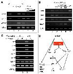 Figure 4. Dorsal mesoderm induction by mNanog was involved with inhibition of BMP signaling.A) Target genes of BMP signaling were inhibited by mNanog injection, based on the expressions of Xvent1 (1st column), Xvent2 (2nd column), BMP4 (3rd column), and ODC (4th column). 0 pg (lane 3, 4), 200 pg (lane 5), or 400 pg (lane 6) of mNanog was injected into animal poles, which were treated with 10 ng/ml of Activin A (lane 4–6) at stage 9. ACs were harvested at stage 11. B) Co-injection analysis with Xvent2 mRNA. 200 pg of mNanog (lane 2–5) and 0 pg (lane 3), 500 pg (lane 4), 1 ng (lane 5), or 2 ng (lane 6) of Xvent2 were co-injected into animal poles at the 2-cell stage. ACs were dissected at stage 9 and homogenized at stage 11 for RNA preparation. The expressions of several dorsal mesoderm genes (chd, gsc, xlim-1) and BMP4 were analyzed. C) Effect of cycloheximide (CHX) on the induction of mesoderm genes by mNanog. 0 pg (lane 1, 2) or 400 pg (lane 3, 4) of mNanog was injected into animal poles at the 2-cell stage, 0 mg/ml (lane 1, 3) or 40 mg/ml (lane 3, 4) of CHX was added. D) Model of expected mechanism of mesoderm gene induction by mNanog. “X indicates presumptive factor(s) for regulating both Xvent1/2 and Xnr1/2 expression by mNanog.