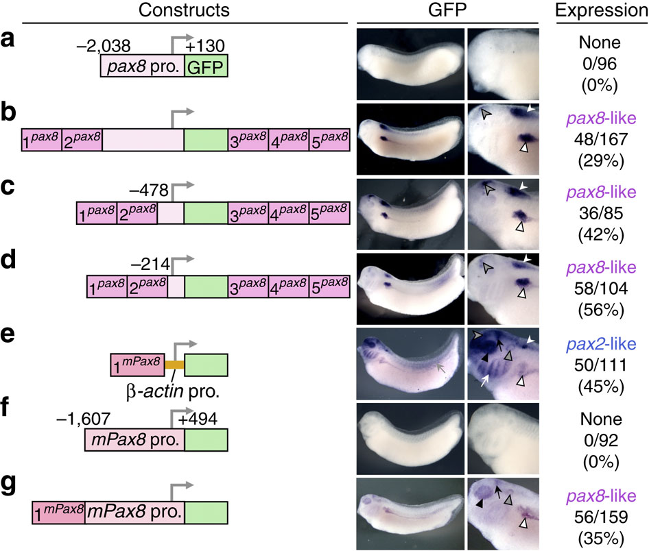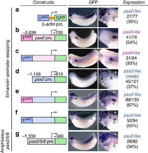 Figure 4: Silencer innovation in pax8 is crucial for generating divergence in the expression of pax8 and pax2. Transgenic X. laevis embryos were generated with the following GFP constructs. (a) The X. tropicalis pax2-CNS1 (shown as 1pax2) was linked to the β-actin basal promoter-GFP cassette. (b,c) The X. tropicalis pax8 proximal promoter (−2038 to +130) was flanked by either the X. tropicalis pax8-CNS1 (b) or pax2-CNS1 (c). (d) The proximal promoter region of X. tropicalis pax2 (−1109 to +615) alone was linked to GFP. (e,f) The X. tropicalis pax2 proximal promoter was flanked by either the X. tropicalis pax8-CNS1 (e) or pax2-CNS1 (f). (g) The amphioxus pax2/5/8 promoter (−1330 to +589) was linked to GFP. White, grey and black triangles indicate expression in the pronephros, otic vesicle and eye, respectively. White, grey and black arrows indicate expression in the pharyngeal arches, somites and MHB, respectively. White and grey arrowheads indicate expression in the hindbrain and in an anterior part of the midbrain, respectively.