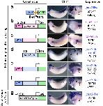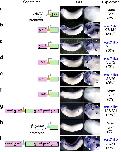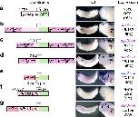 Figure 2: GFP expression driven by pax8-CNSs recapitulates the pleiotropic expression of pax2. Transgenic X. laevis embryos were generated with the following reporter constructs and their expression was analysed using in situ hybridization. (a) The β-actin basal promoter alone was linked to GFP. (bâf) The β-actin promoter-GFP cassette was flanked by either X. tropicalis pax8-CNS1 (b), pax8-CNS2 (c), pax8-CNS3 (d), pax8-CNS4 (e) or pax8-CNS5 (f). (g) The β-actin promoter-GFP cassette was flanked by all the pax8-CNSs. (h) The β-globin basal promoter alone was linked to GFP. (i) The β-globin promoter-GFP cassette was flanked by all the pax8-CNSs. The X. tropicalis pax8-CNS1 to pax8-CNS5 are shown as 1pax8 to 5pax8. Representative examples of GFP expression are shown together with the injected reporter constructs. The right-hand panels show high-magnification views of the embryonic head regions illustrated in the left-hand panels. GFP expression patterns are summarized on the extreme right with the scoring results. Numbers of embryos with the positive expression similar to the representative examples, and the total number of analysed embryos injected with each construct are indicated with percentages of the former cases. White, grey and black triangles indicate expression in the pronephros, otic vesicle and eye, respectively. White, grey and black arrows indicate expression in the pharyngeal arches, somites and MHB, respectively. White and grey arrowheads indicate expression in the hindbrain and anteriormidbrain, respectively.