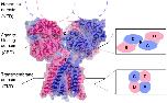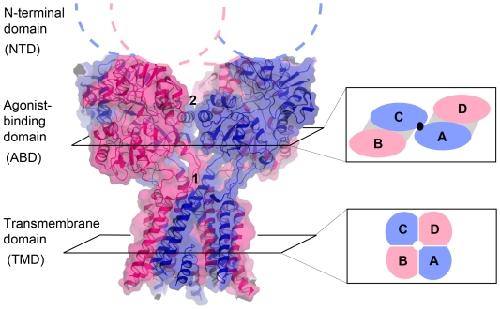 Figure 1. Subunit organization of the tetrameric GluA2 AMPA receptor.Side view of the gating core (ABD + TMD) of the GluA2 homotetramer [4]. The subunits adopt two different conformations, A/C (blue) and B/D (red). The insets on the right show how subunits are organized in the ABD and TMD (pore) layer. The grey shading indicates the two local ABD dimers. The black dot indicates the point of contact between subunits A and C at the dimer-of-dimers interface in the ABD layer. Numbers 1 and 2 highlight the two regions where mutations have been introduced in NMDARs.